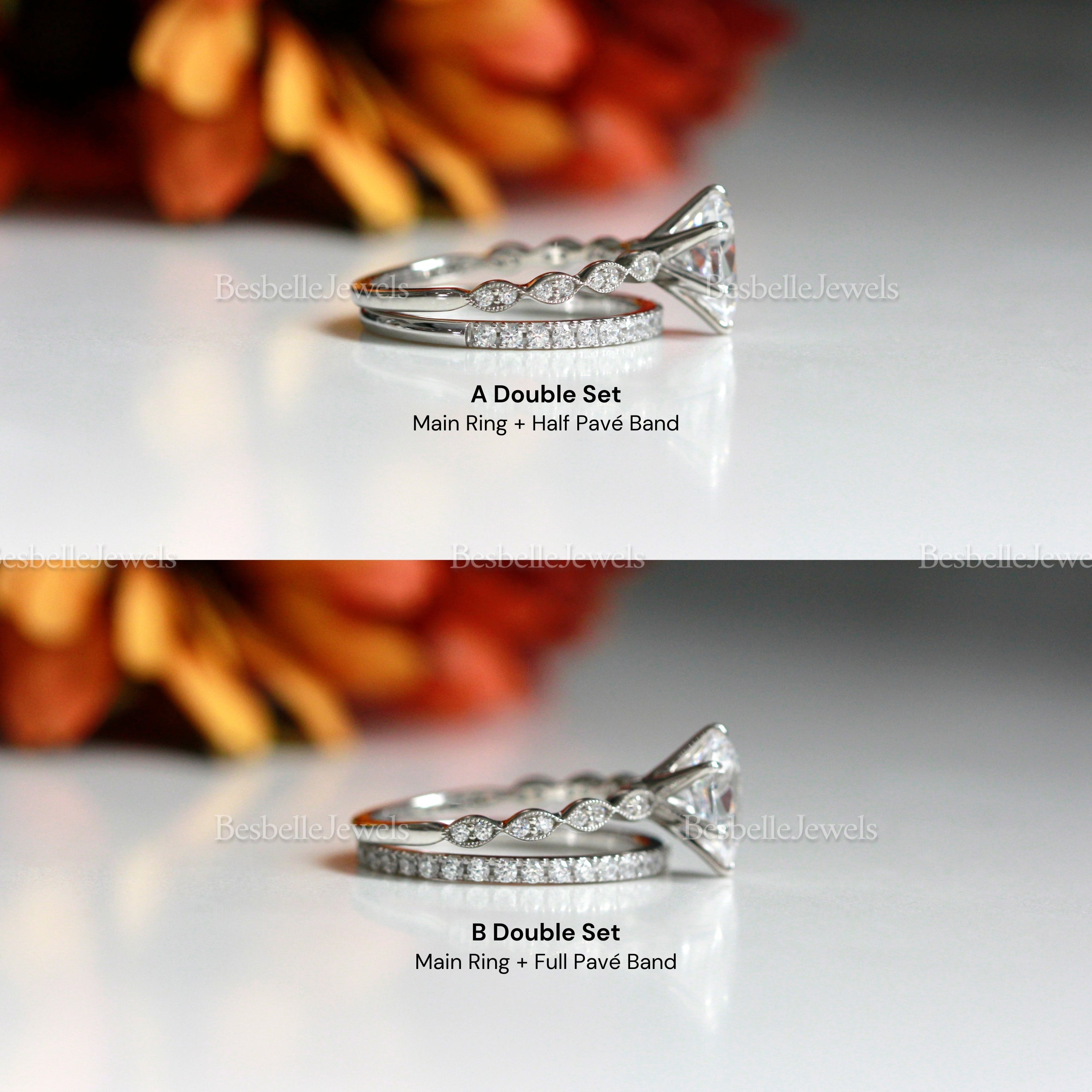 A dainty pave band brings out the unique design of the Anton Ring in this matching ring set. Choose between the eternity band for sparkle that goes all the way around or the half eternity that sparkles parallel to the Anton Ring band.