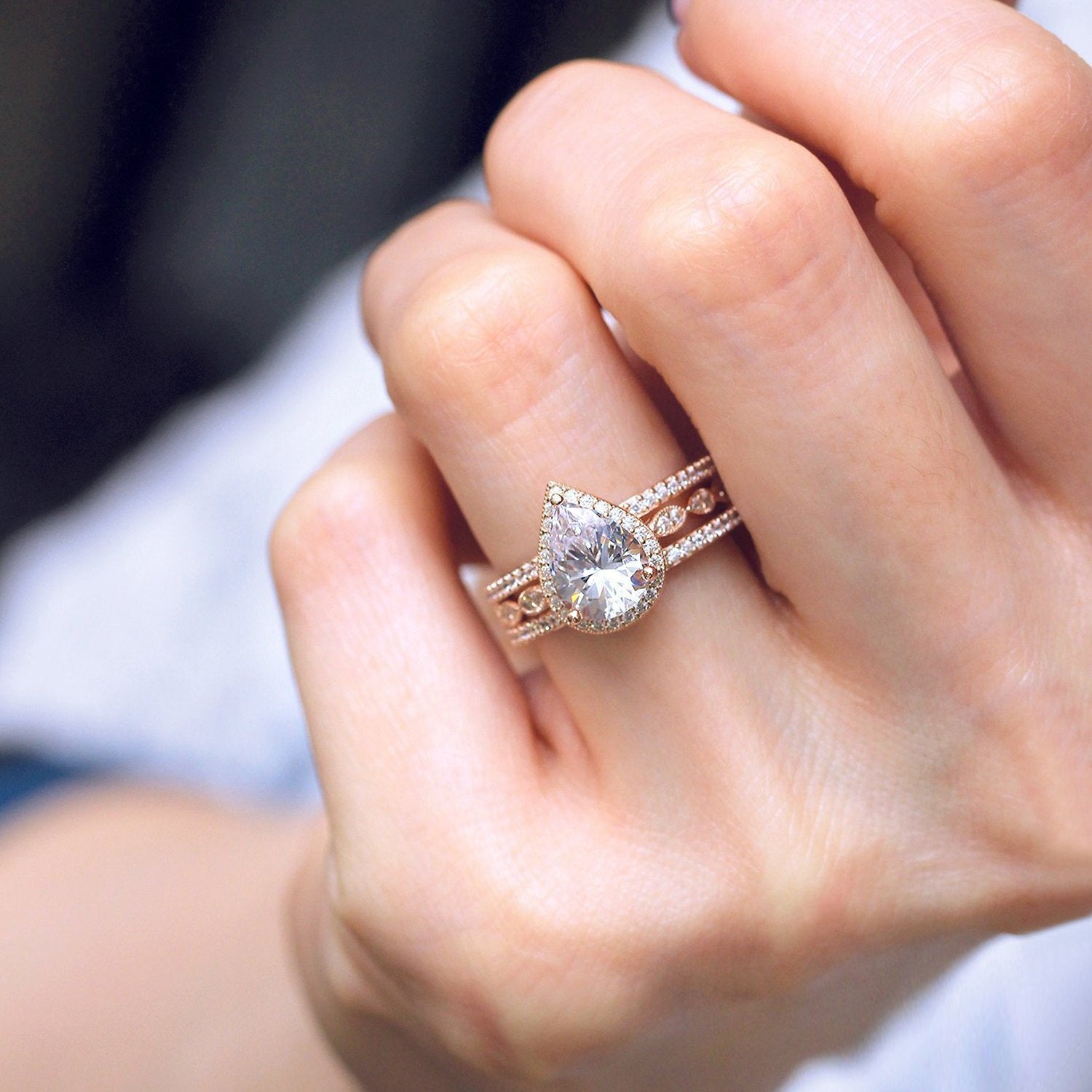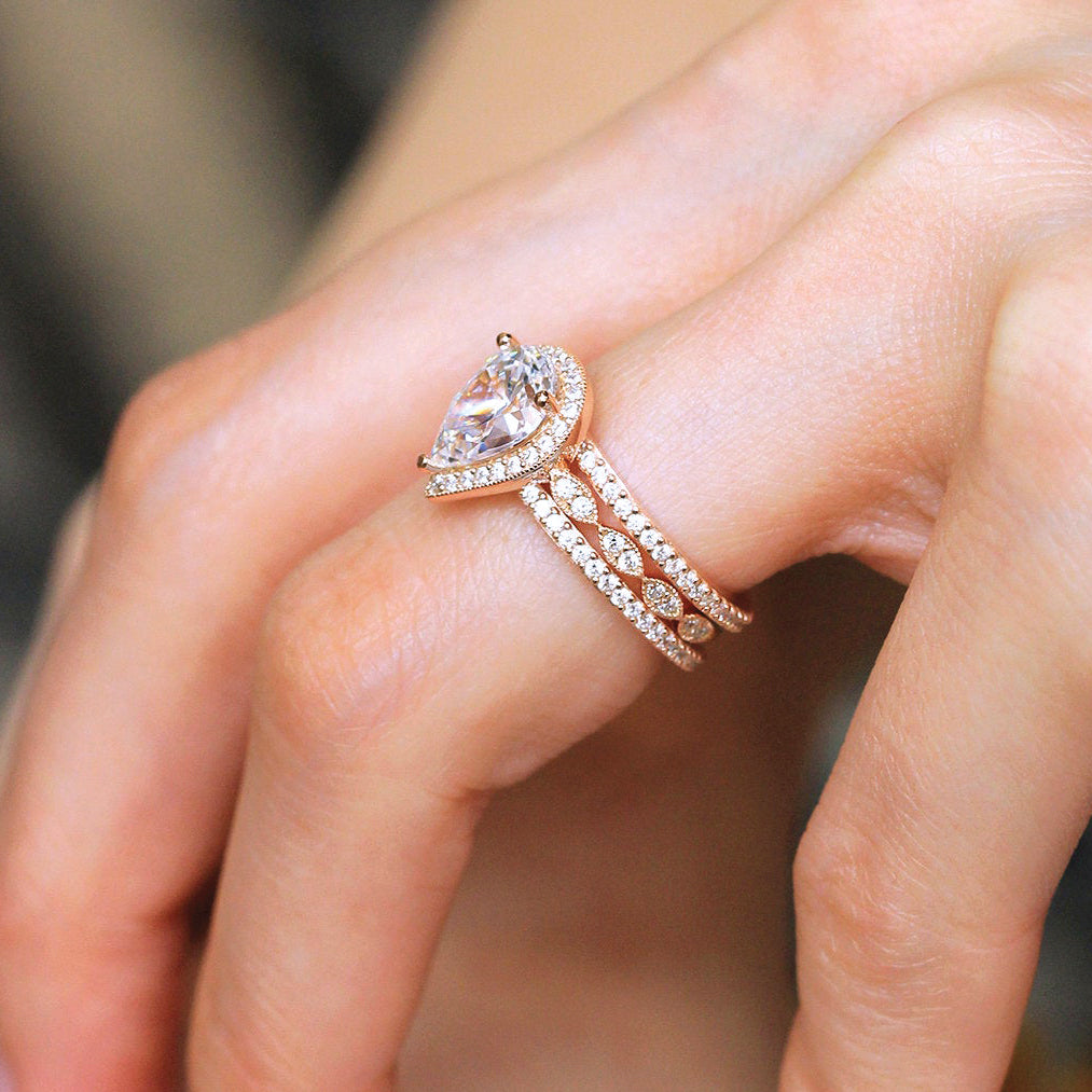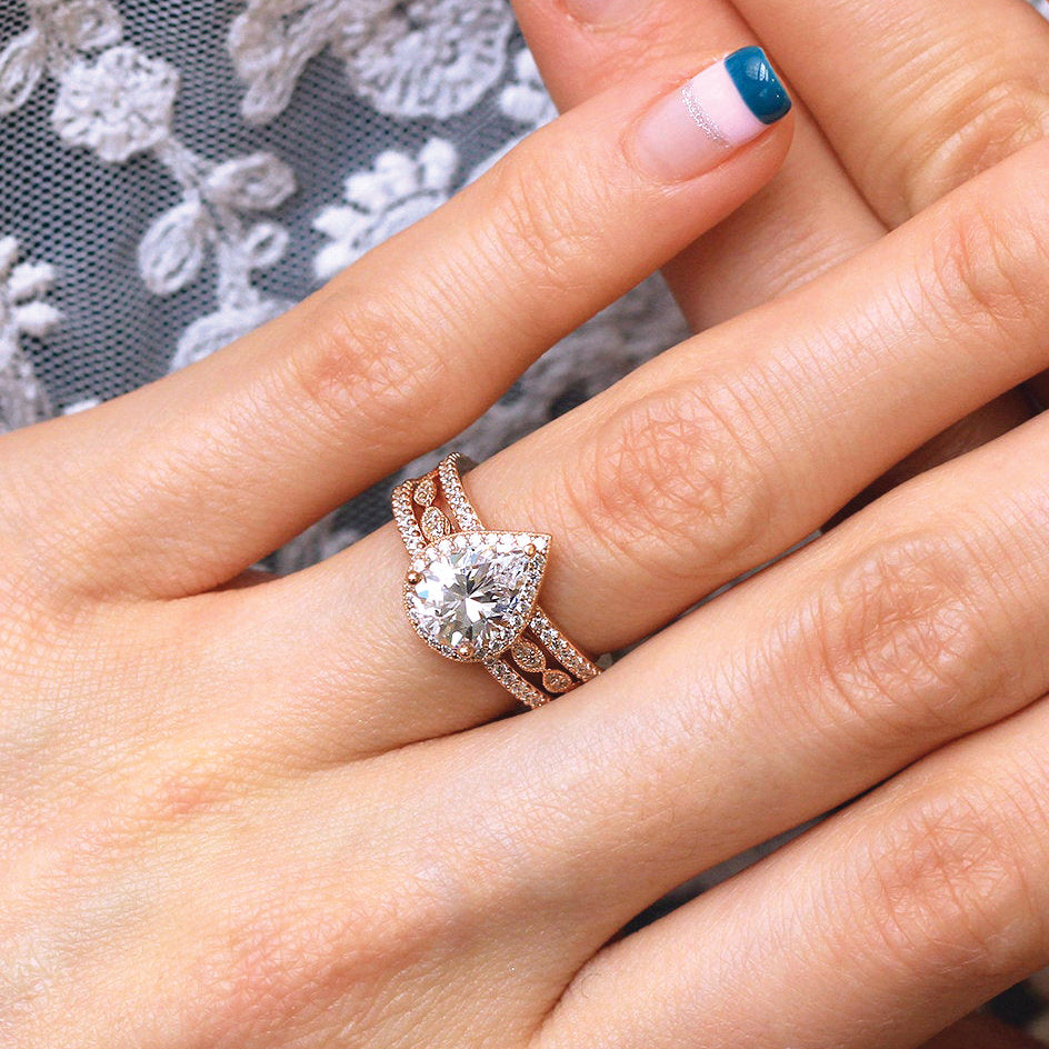 Vintage Art Deco • Pear Halo Pavé Triple Ring Set • Rose Gold • BR6253-3P