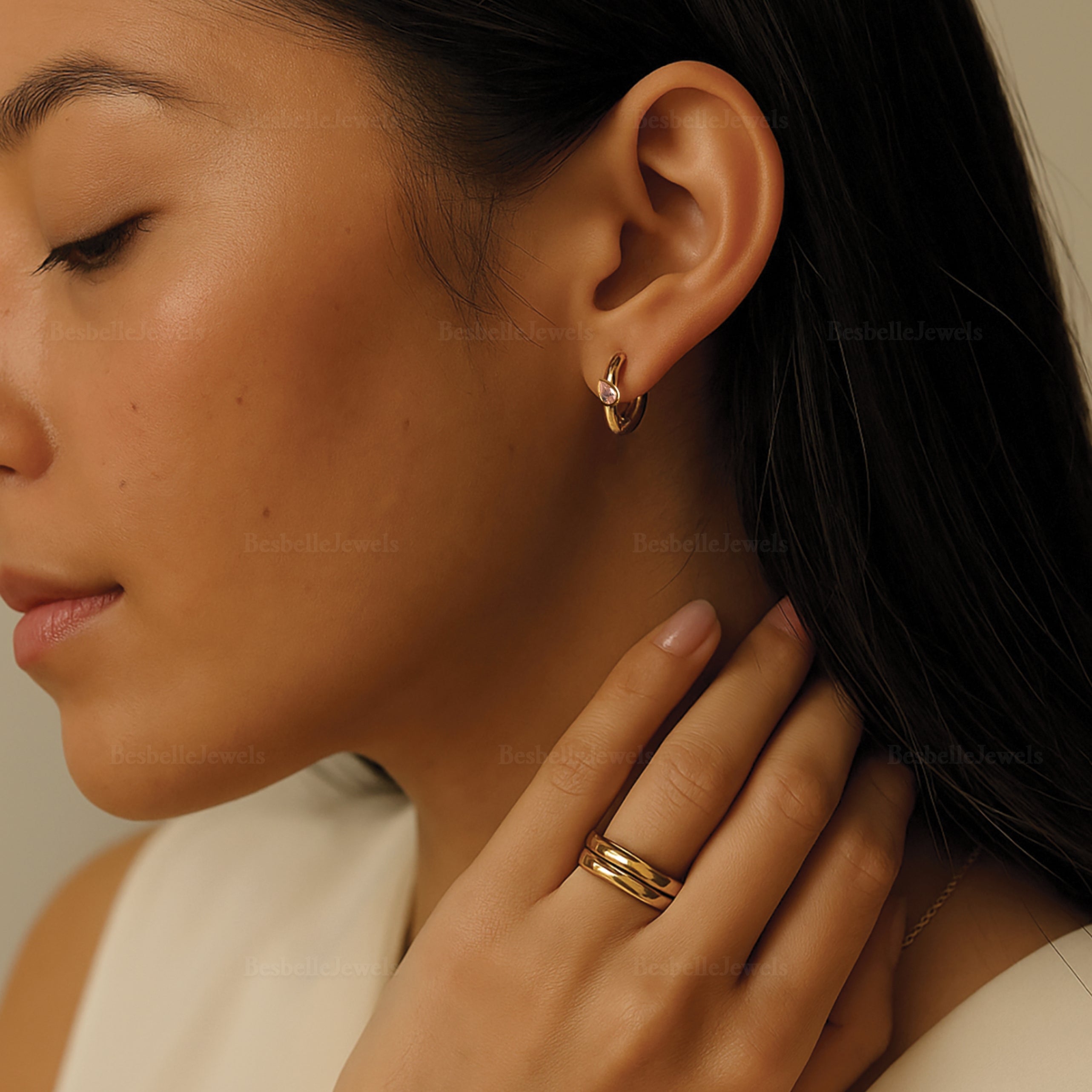 Hoops and huggies are versatile earrings that bring a touch of charm and elegance to any look. Hoops, with their bold circular designs, make a statement, while huggies provide a snug and subtle fit for a more understated appeal. Available in various sizes, finishes, and designs, these earrings are perfect for everyday wear or elevating your evening style. Whether you prefer classic polished metal, intricate textures, or modern accents, hoops and huggies are timeless essentials that add personality and sophistication to your jewelry collection.