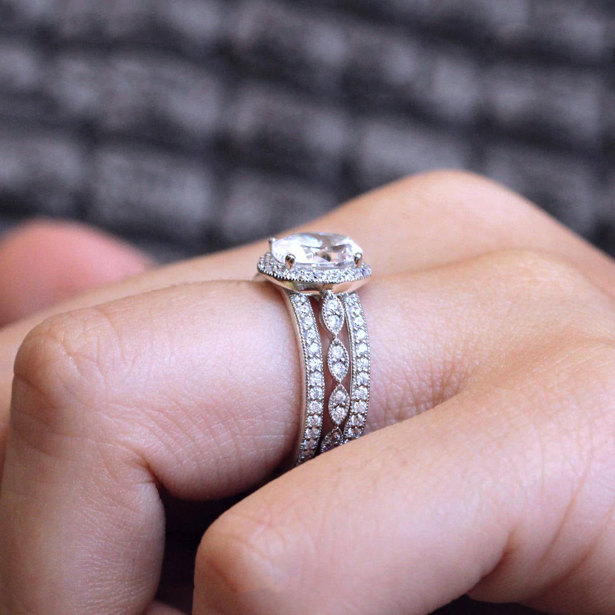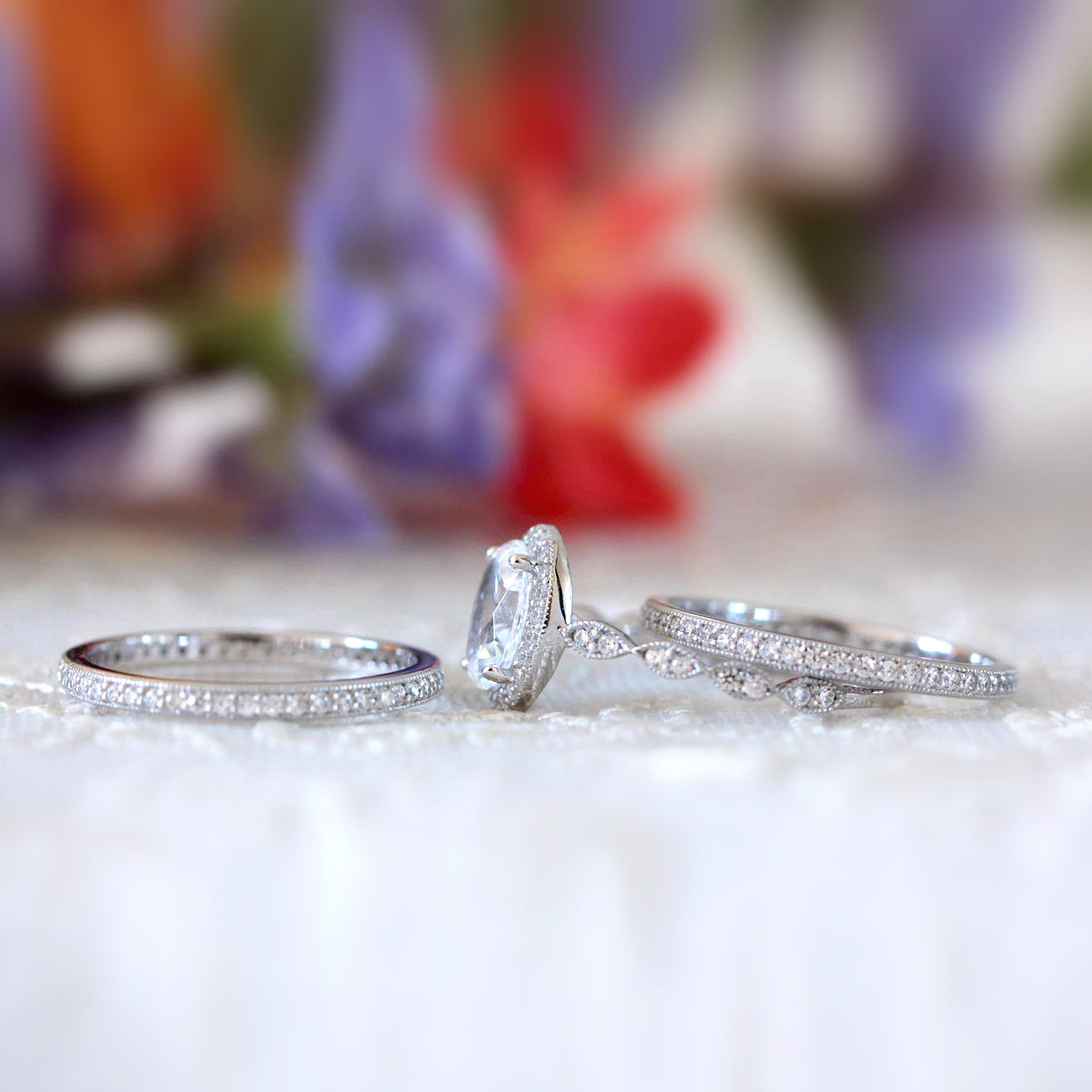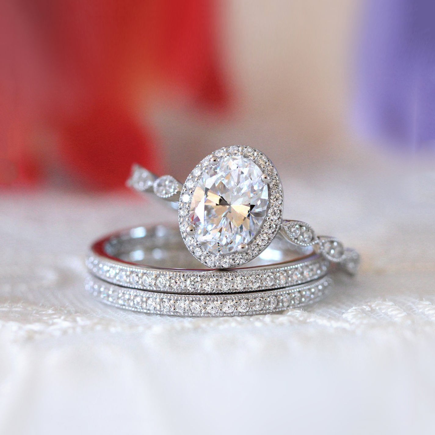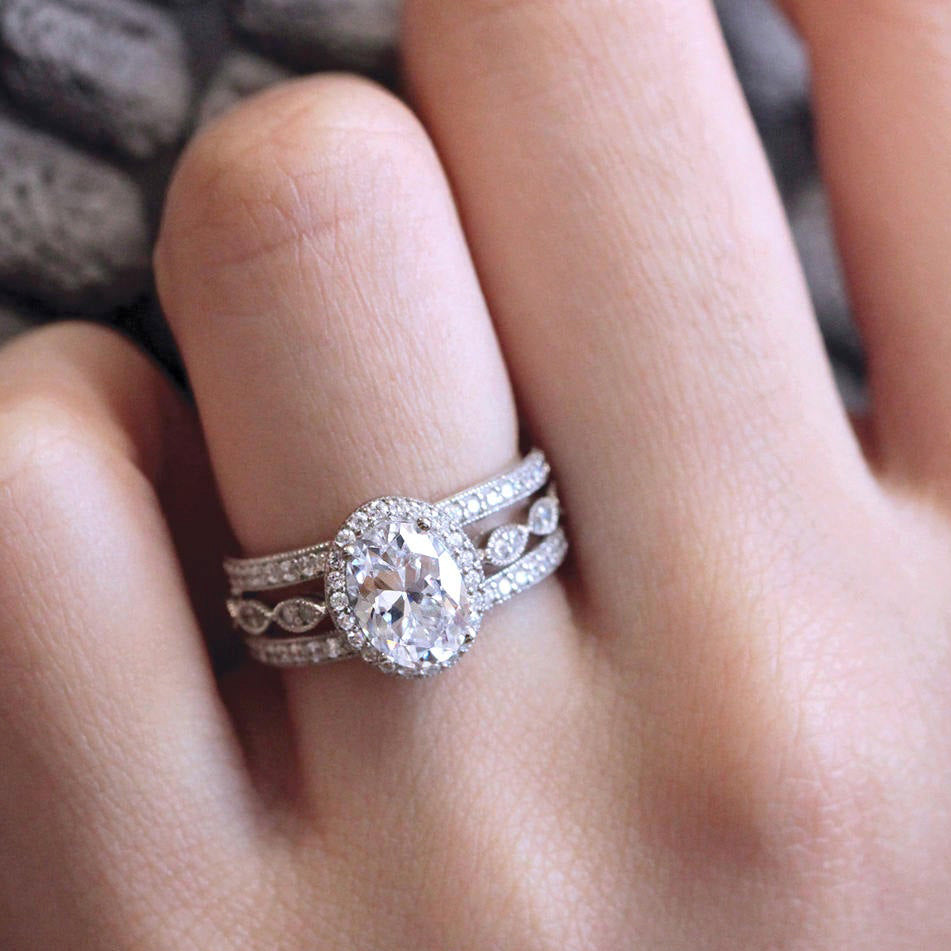 Vintage Art Deco • Oval Halo Milgrain Triple Ring Set • Sterling Silver • BR5953-3M