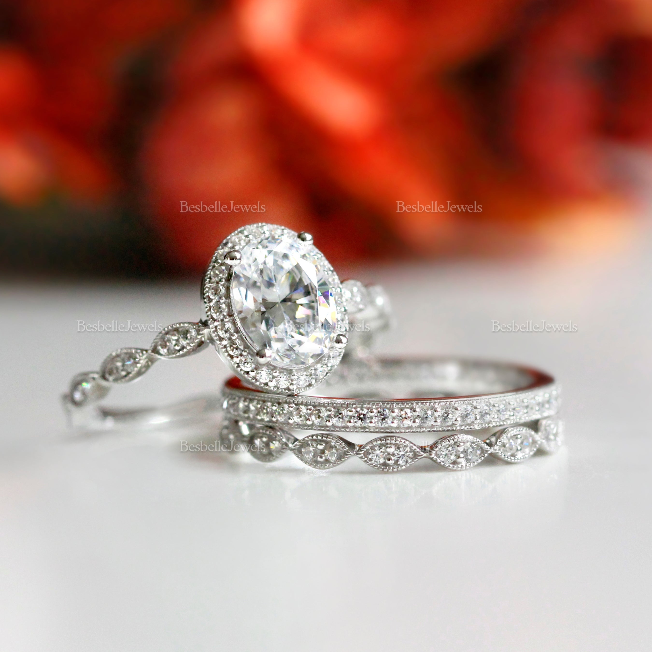Vintage Art Deco • Oval Halo Milgrain Mix Triple Ring Set • Sterling Silver • BR5953-3MX