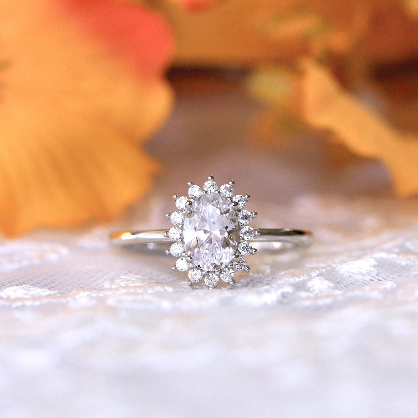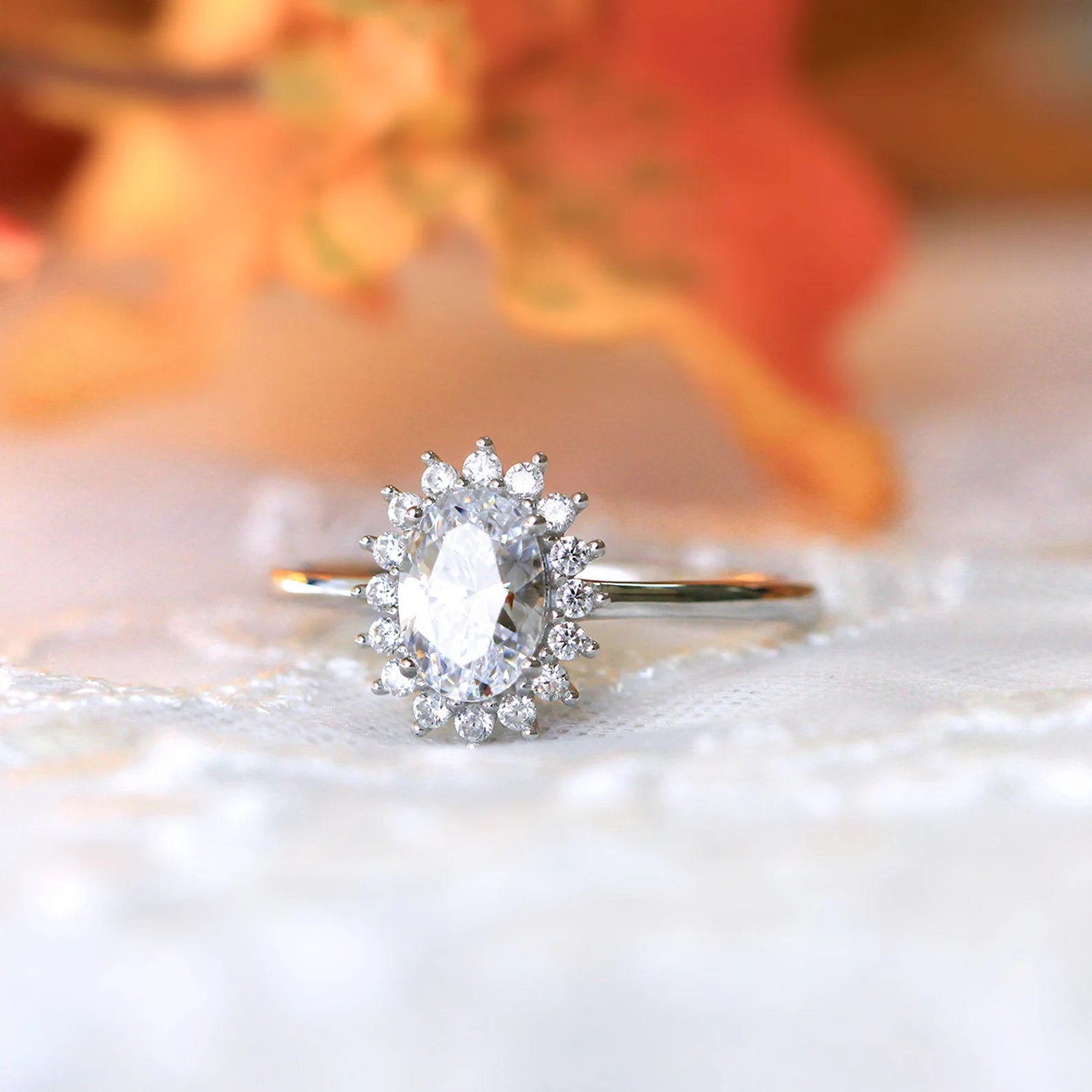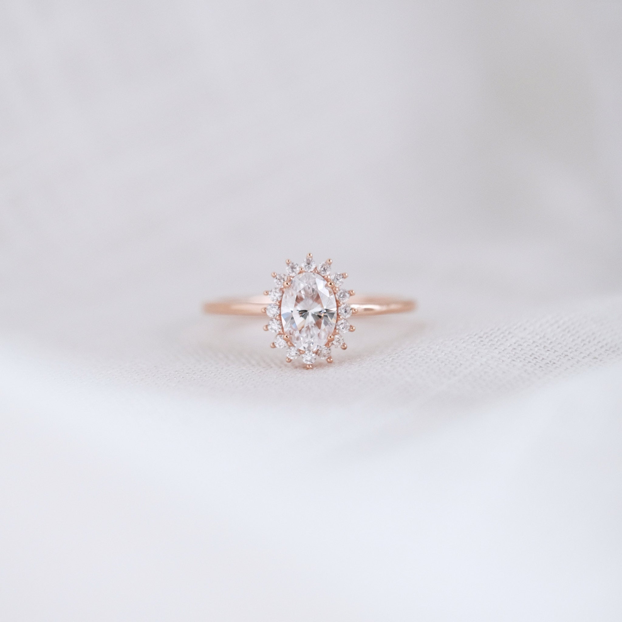 A petal-like halo surrounds a marvelous Oval Stone in this Oval Flower Ring. Carry spring ambience with you all year round.