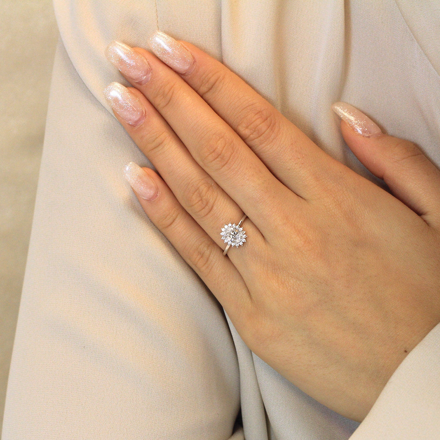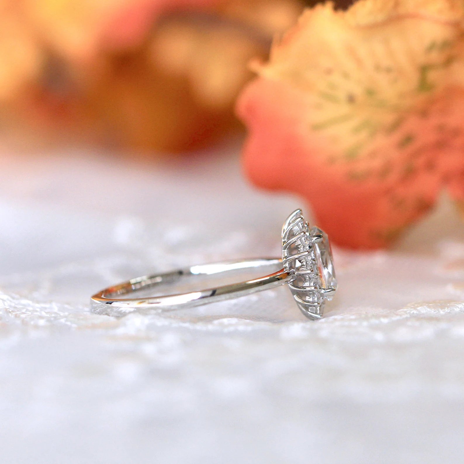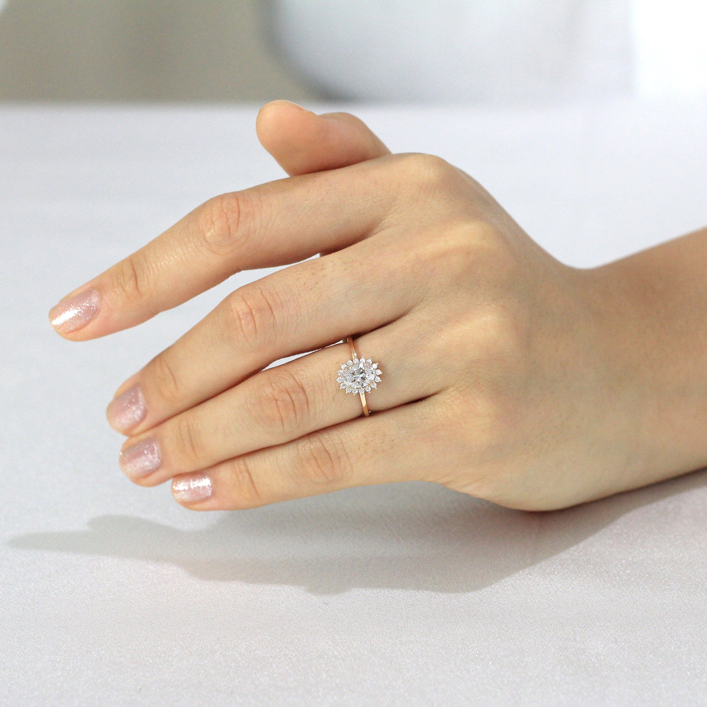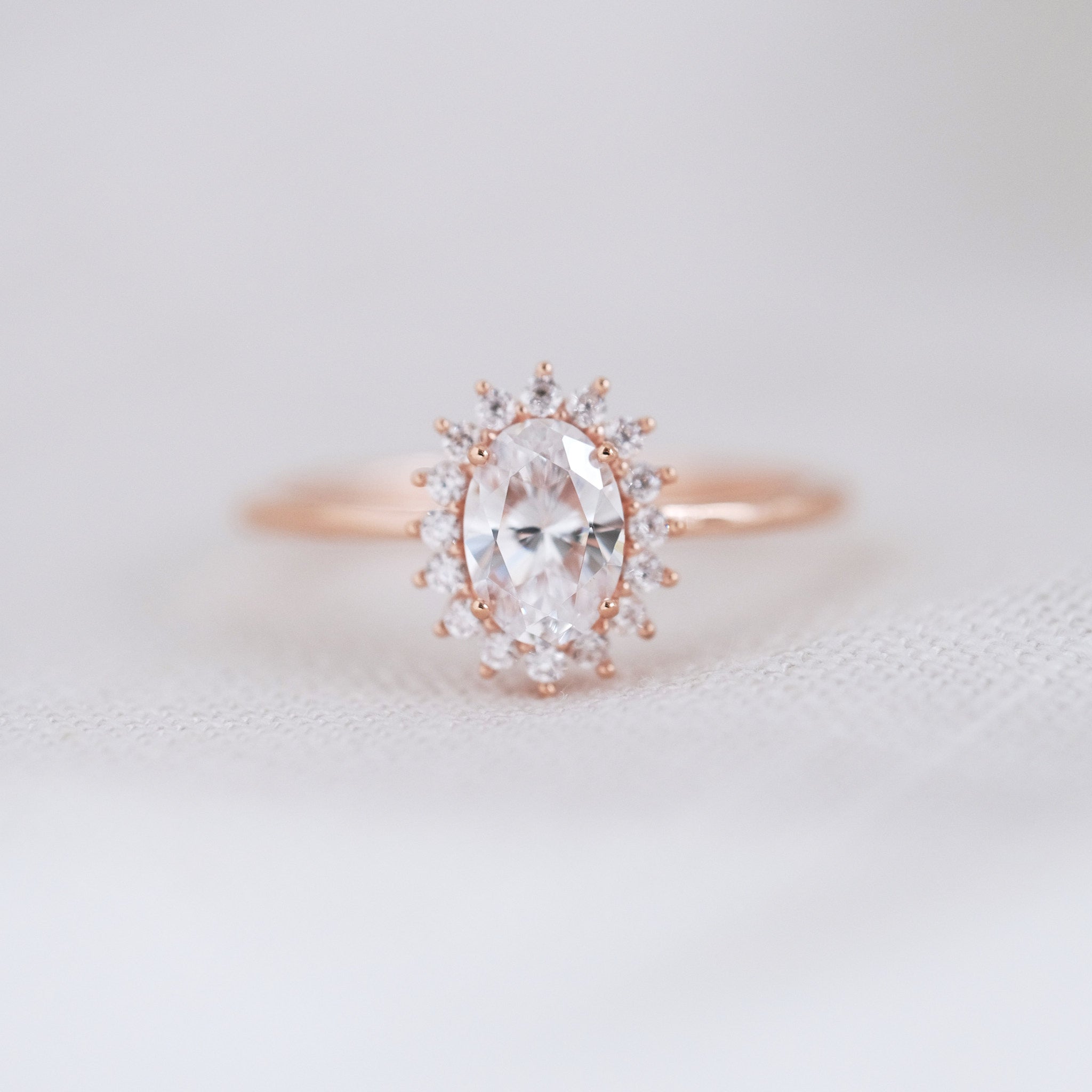 A petal-like halo surrounds a marvelous Oval Stone in this Oval Flower Ring. Carry spring ambience with you all year round.
