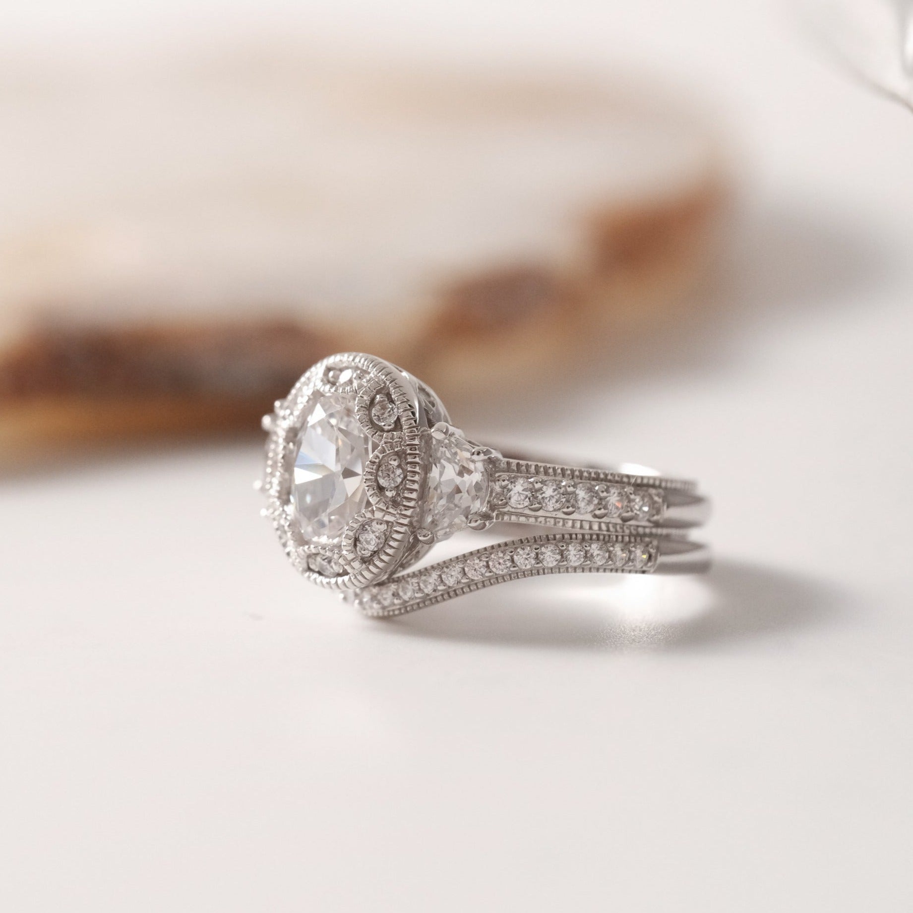 - Stone: Oval Cut, Half Moon Cut (5x3mm), Round Pave Set (1.1mm)