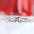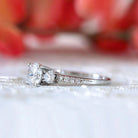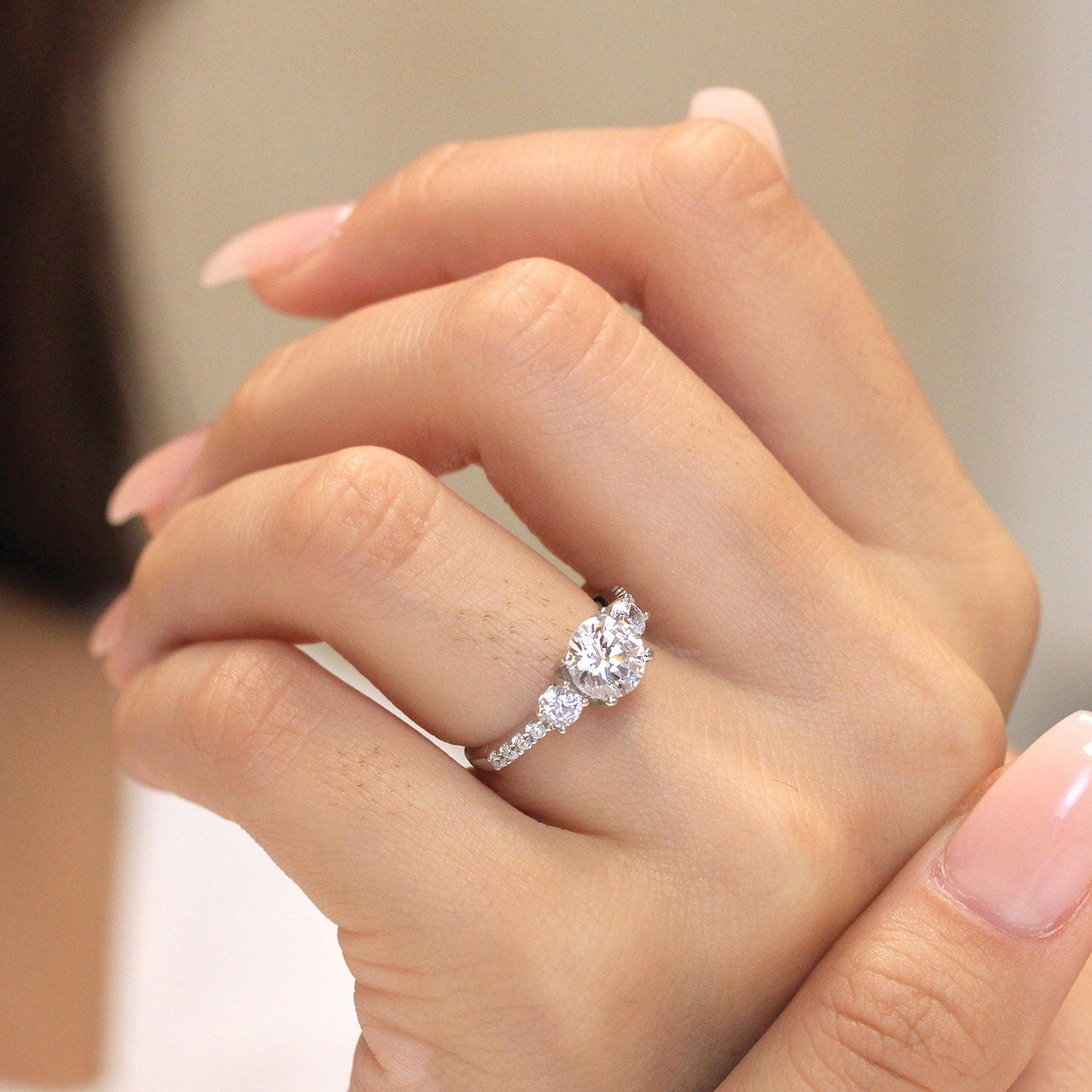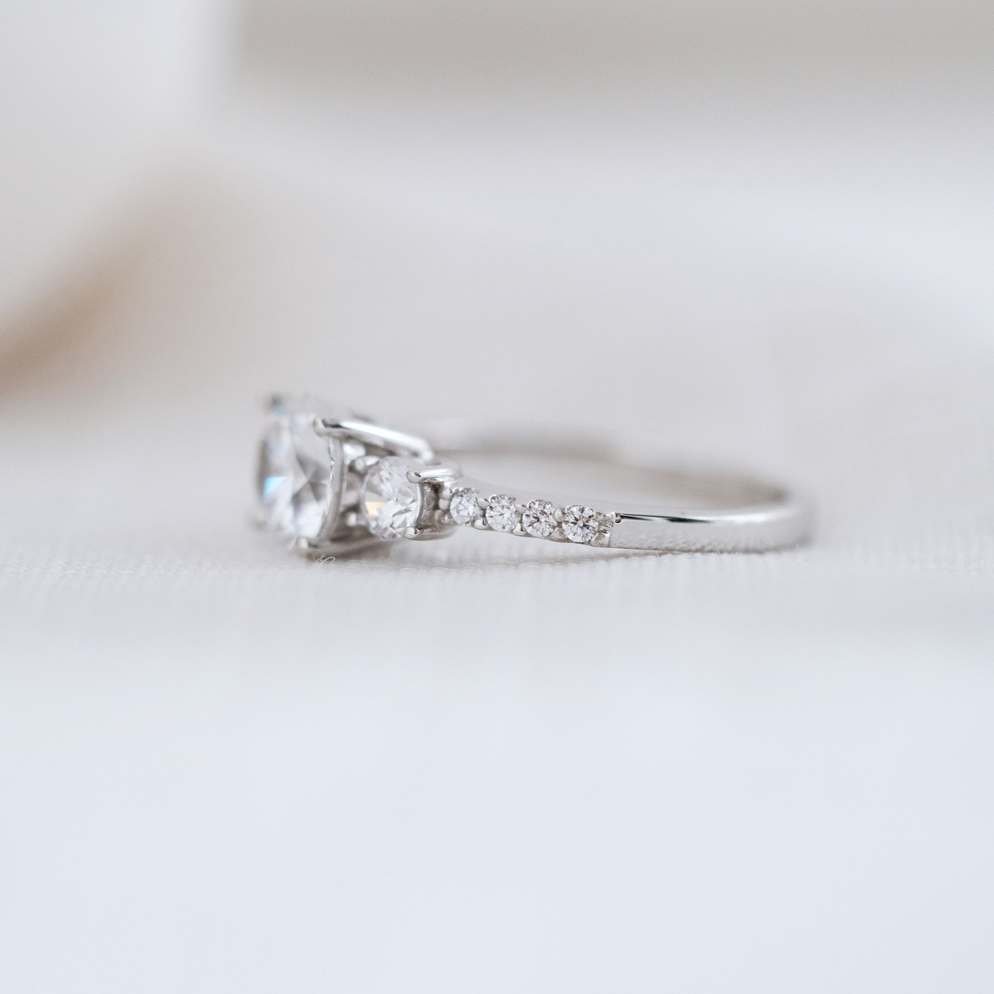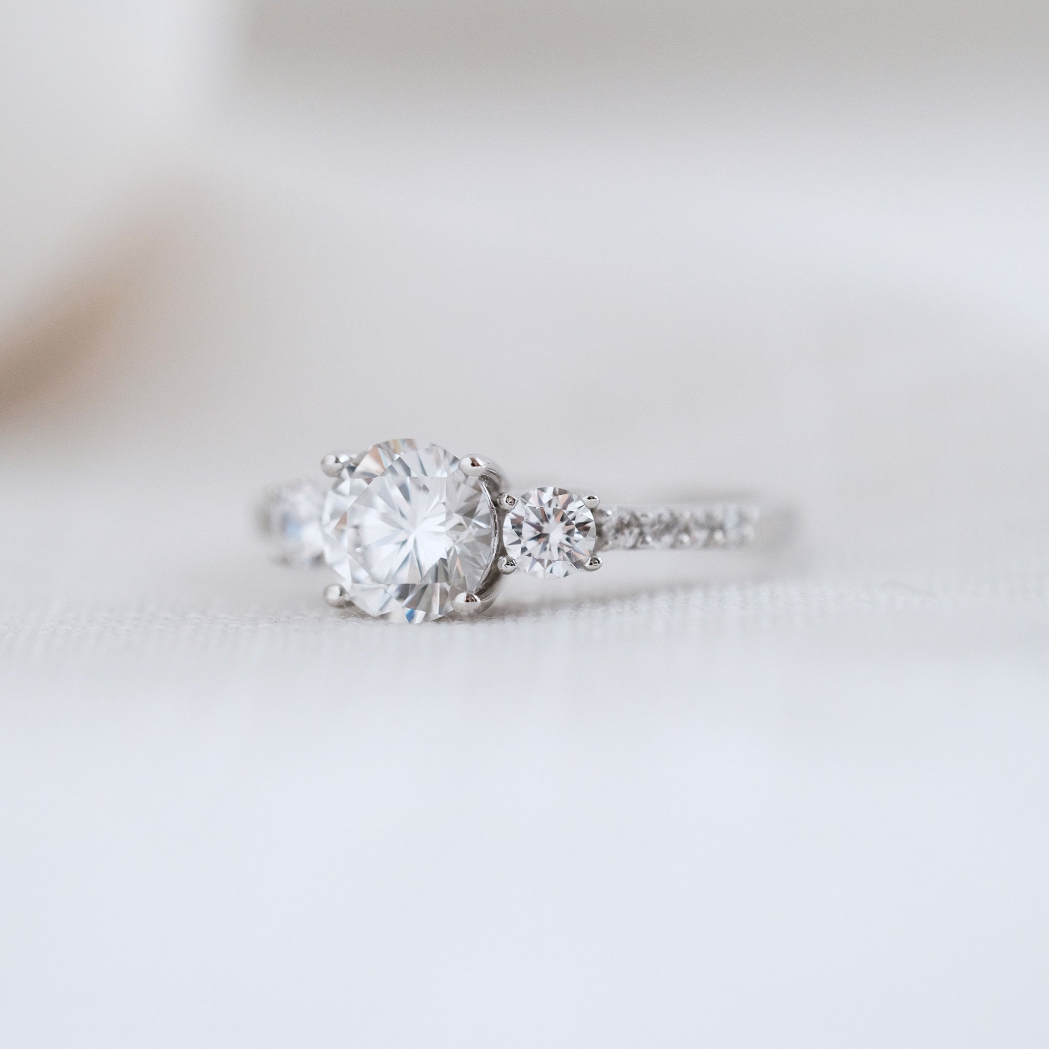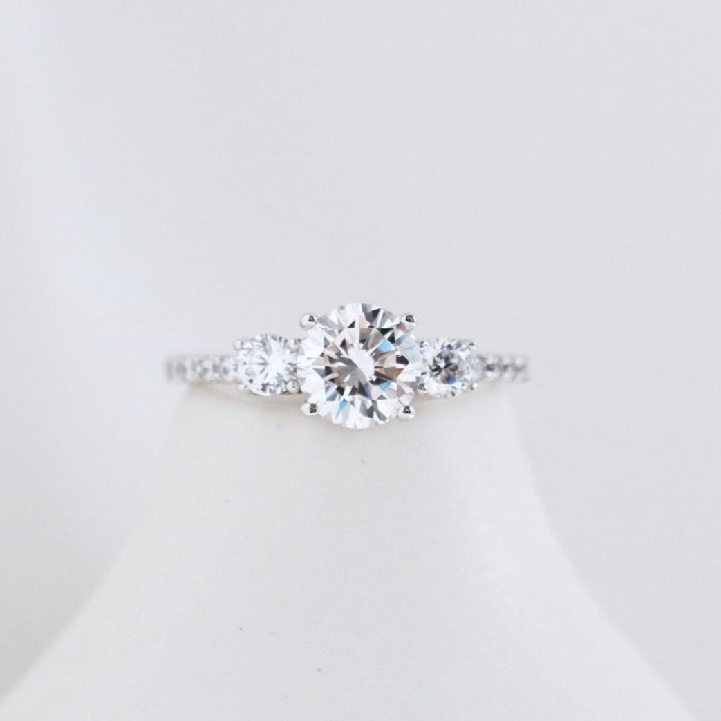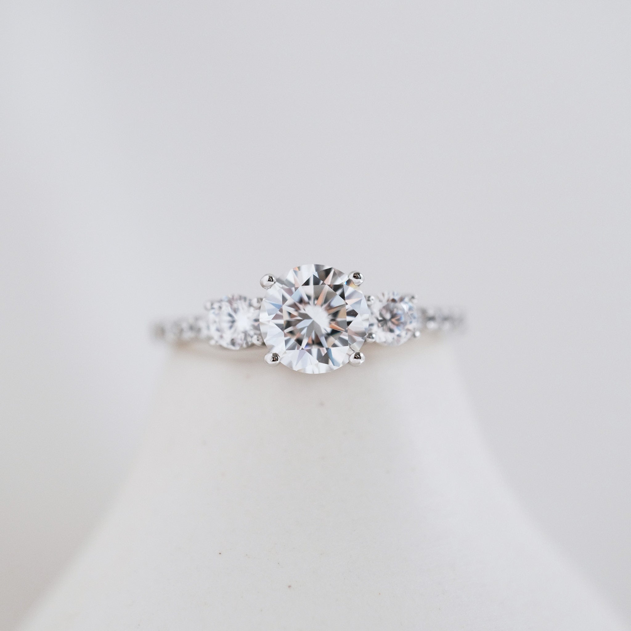 A brilliantly cut Round Cut Centerpiece stone hugged by a smaller duo of Round Cut stones is the 3 Stone Decor Ring. With the Round Pavé Cut set on the band, wear and decor your fingers away.