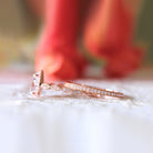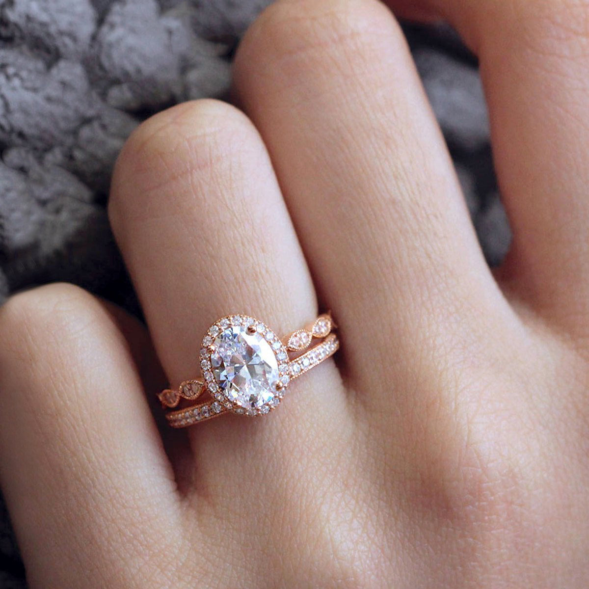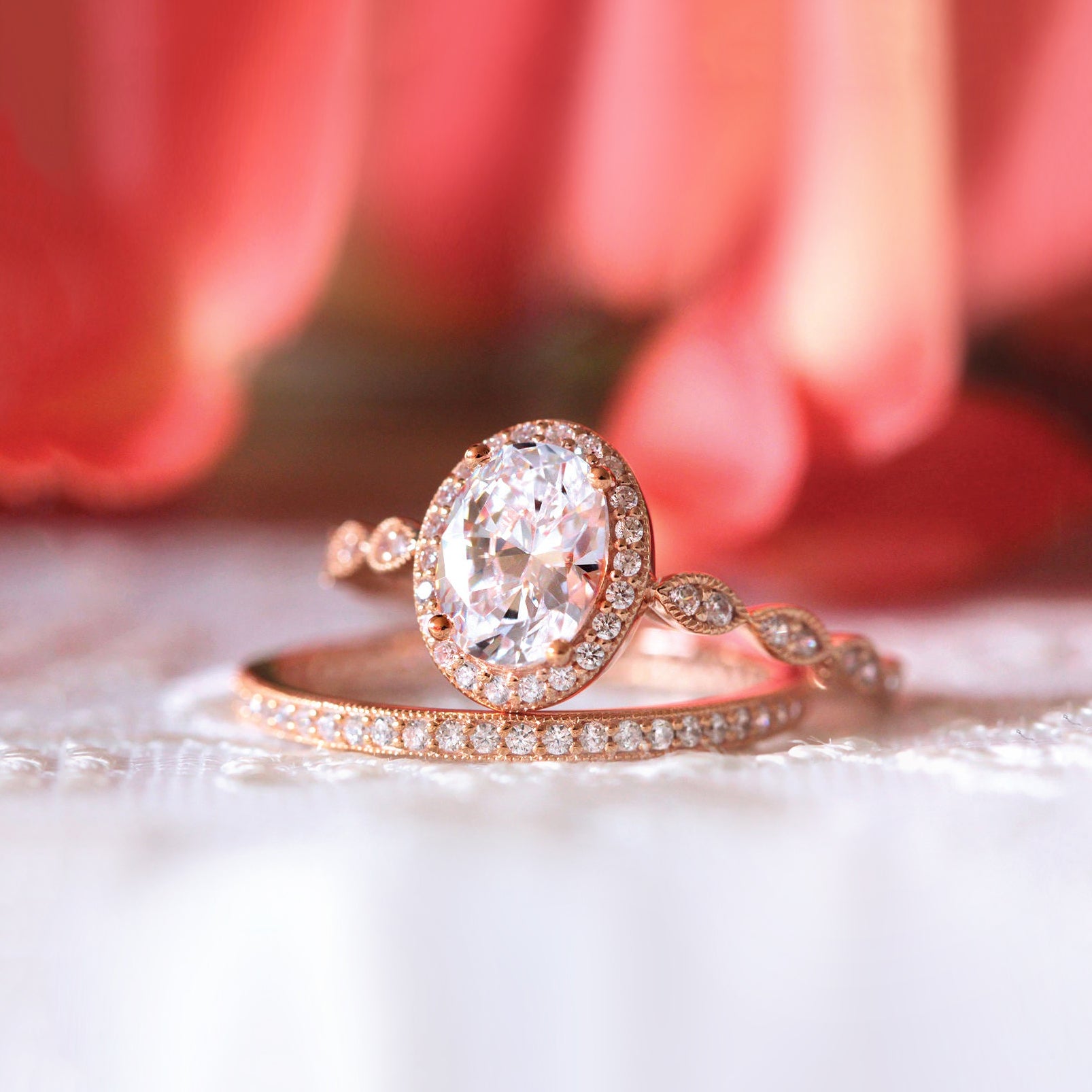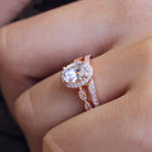 Vintage Art Deco • Oval Halo Milgrain Ring Set • Rose Gold • BR5953-2M