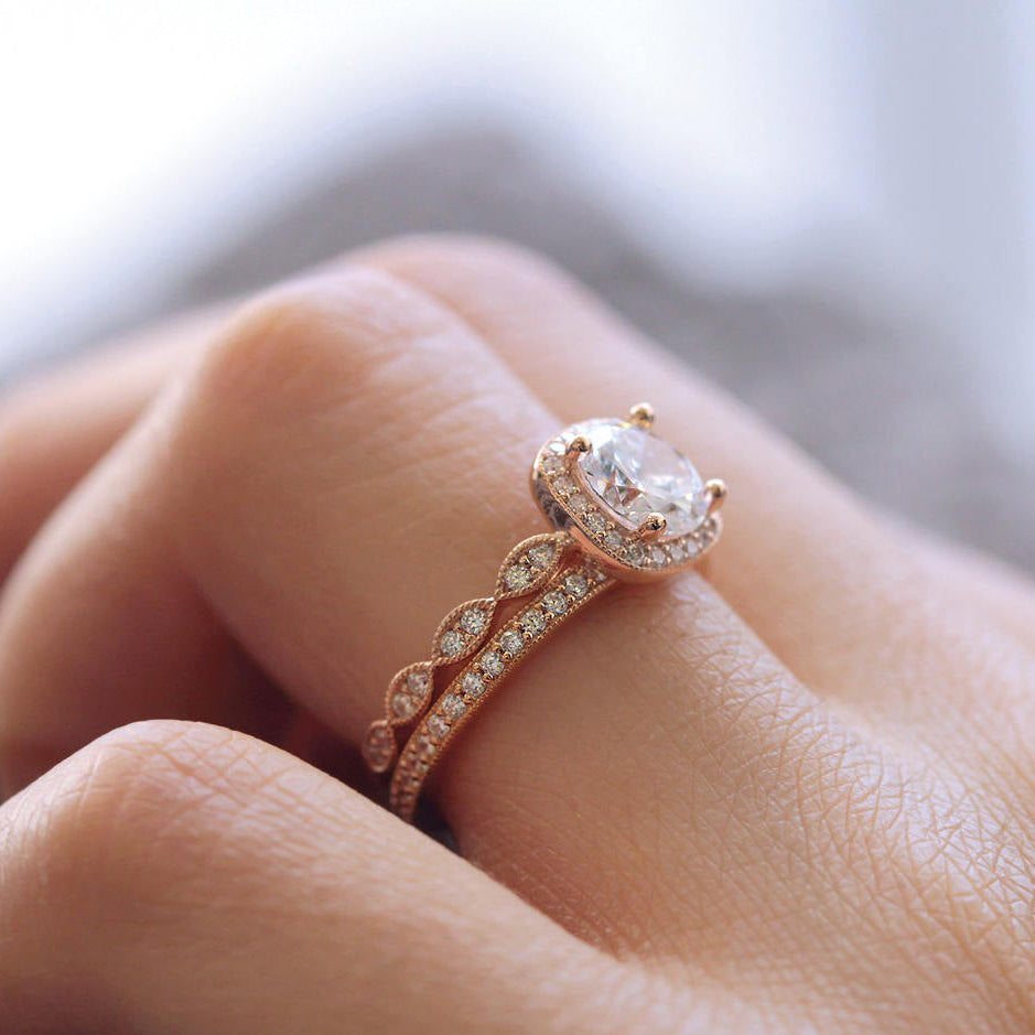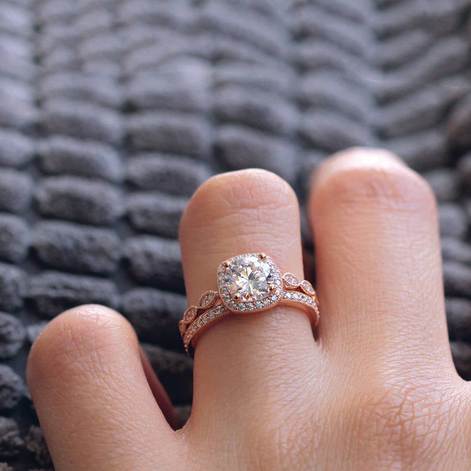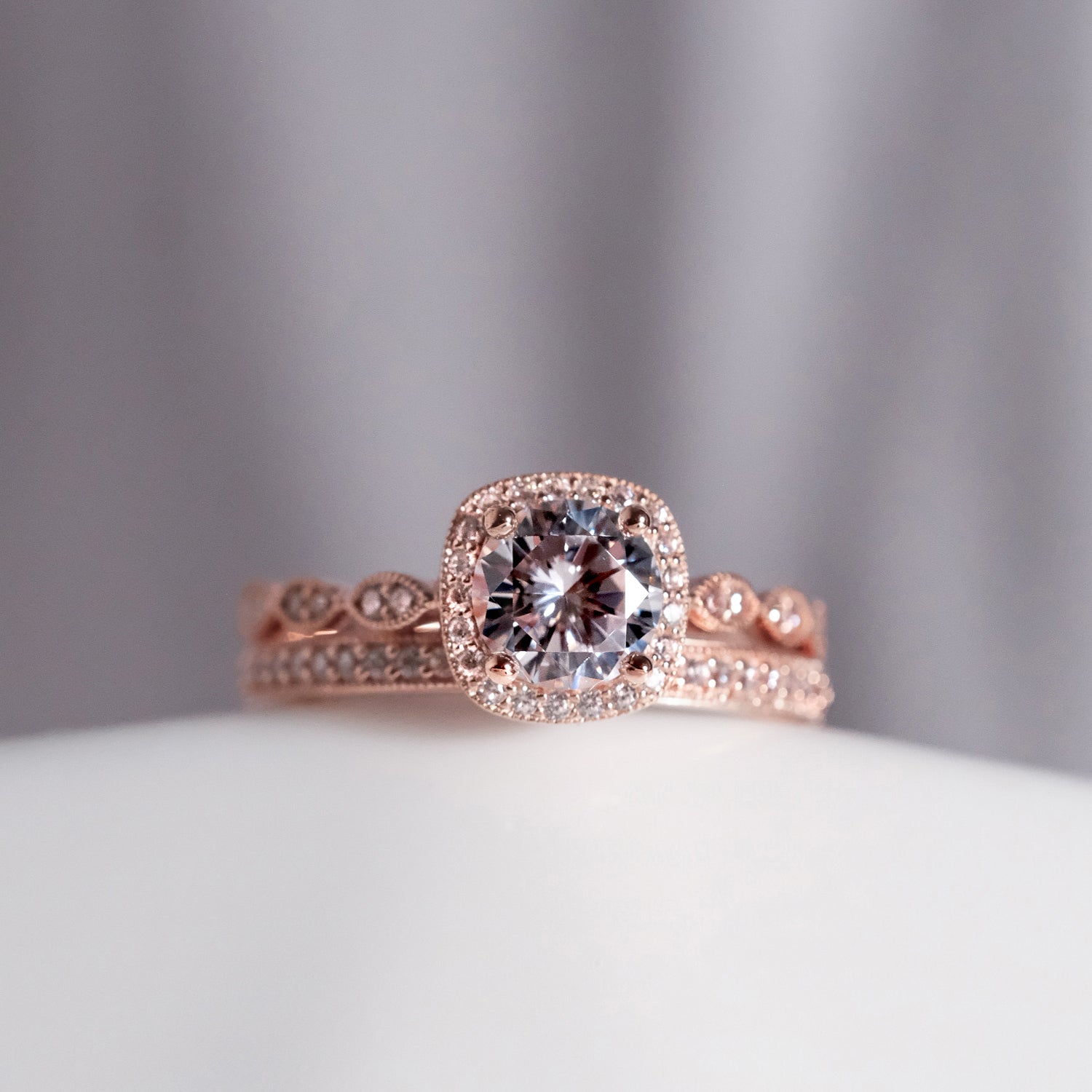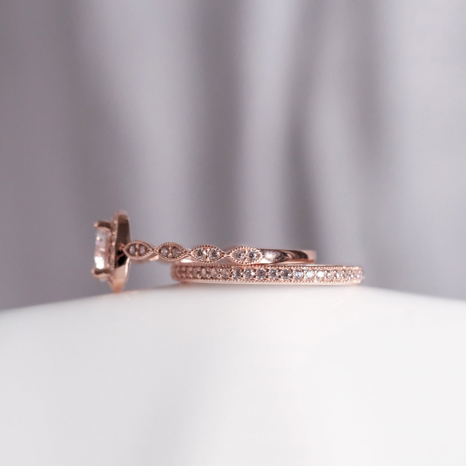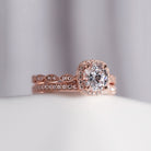Vintage Art Deco • Round Halo Milgrain Ring Set • Rose Gold • BR5553-2M