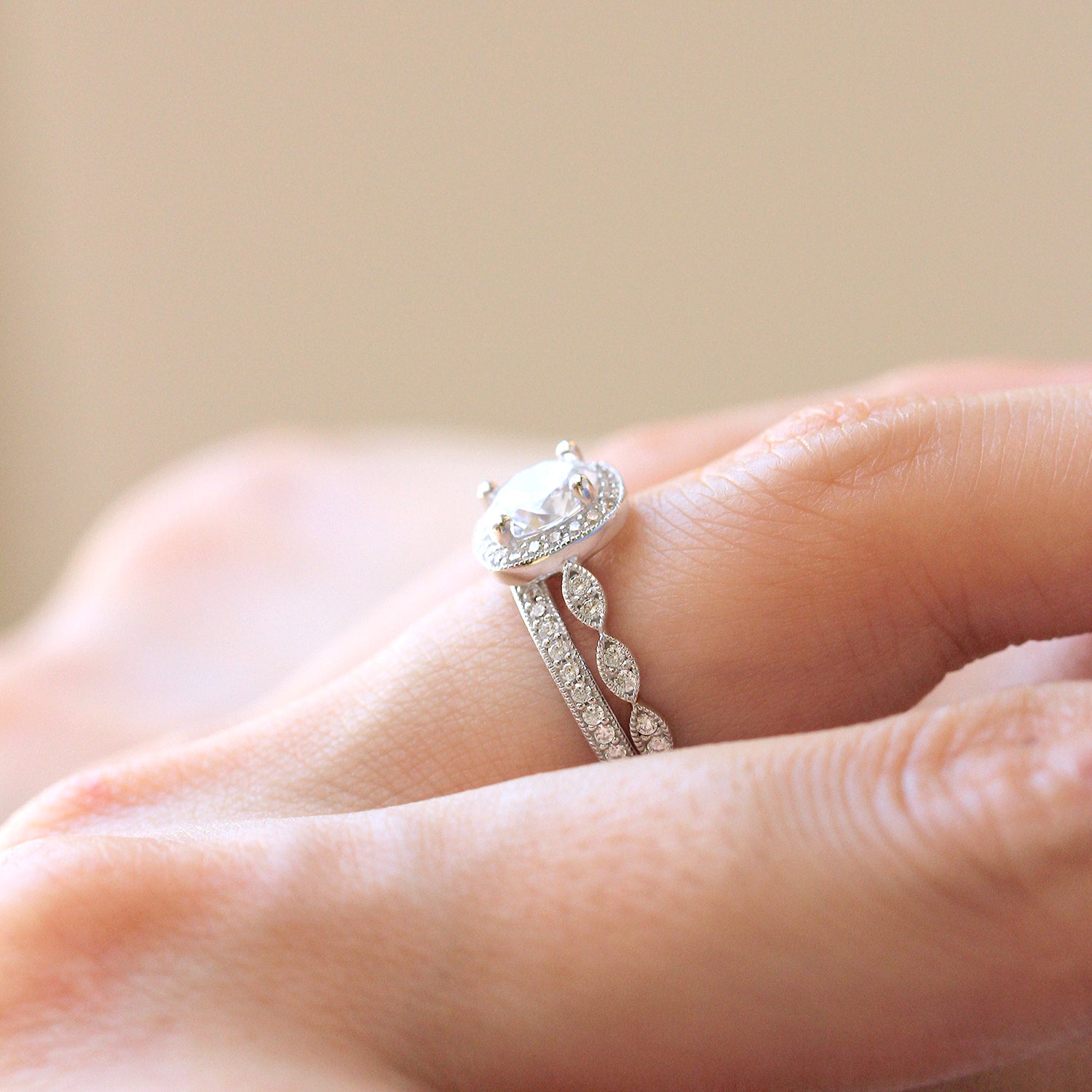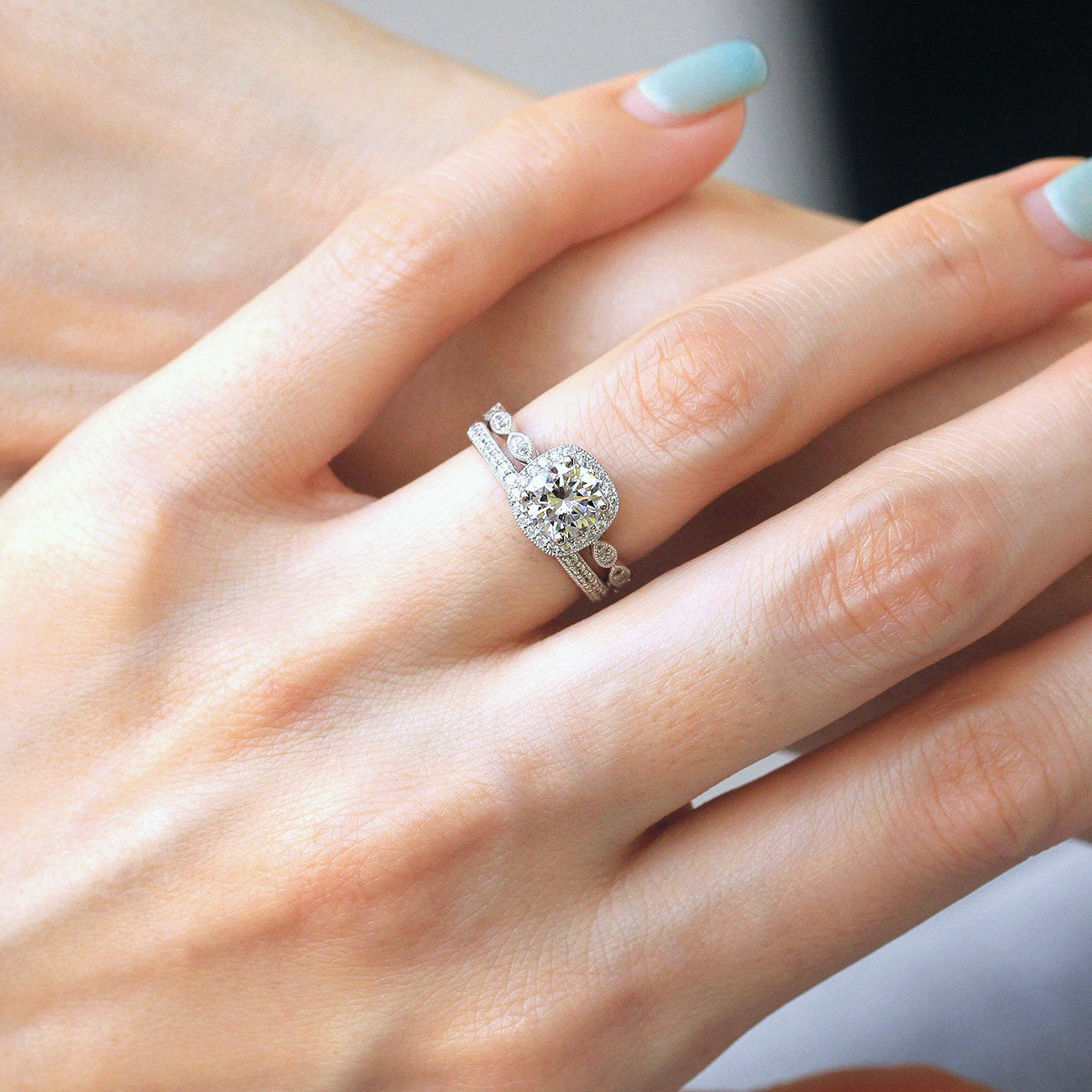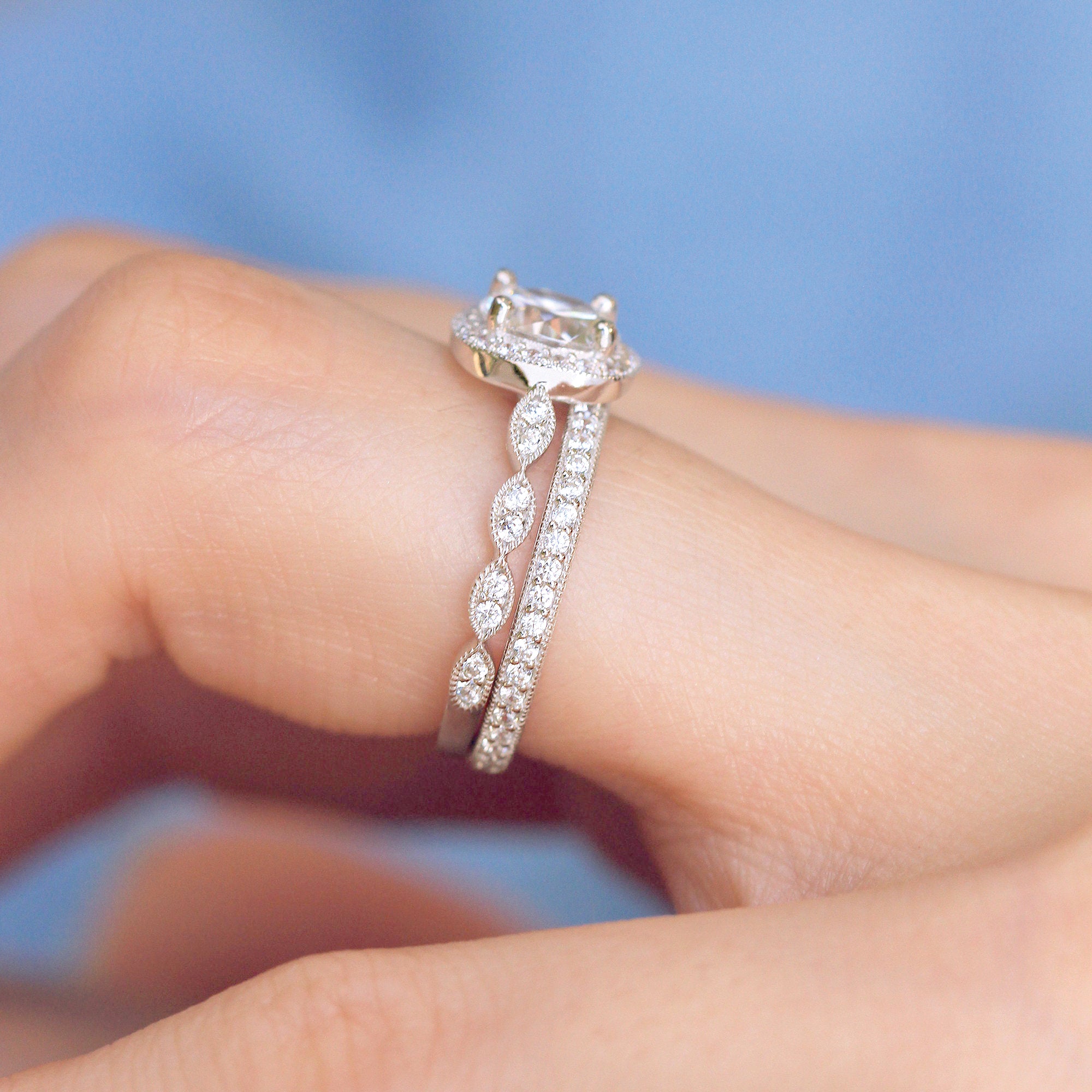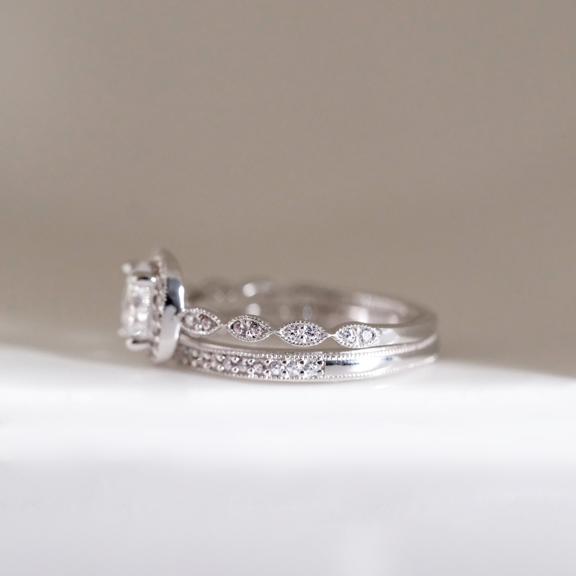 Vintage Art Deco • Round Halo Milgrain Ring Set • Sterling Silver • BR5553-2M