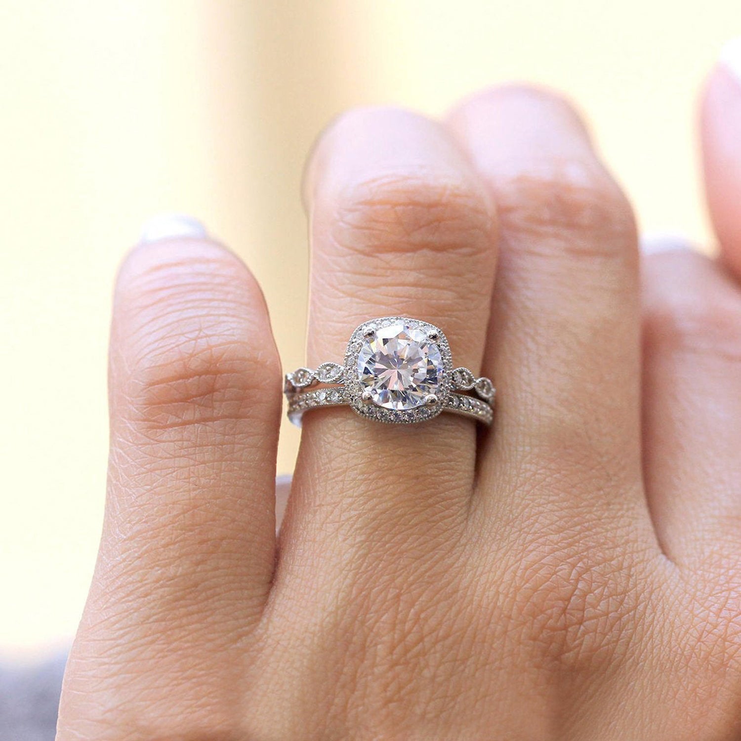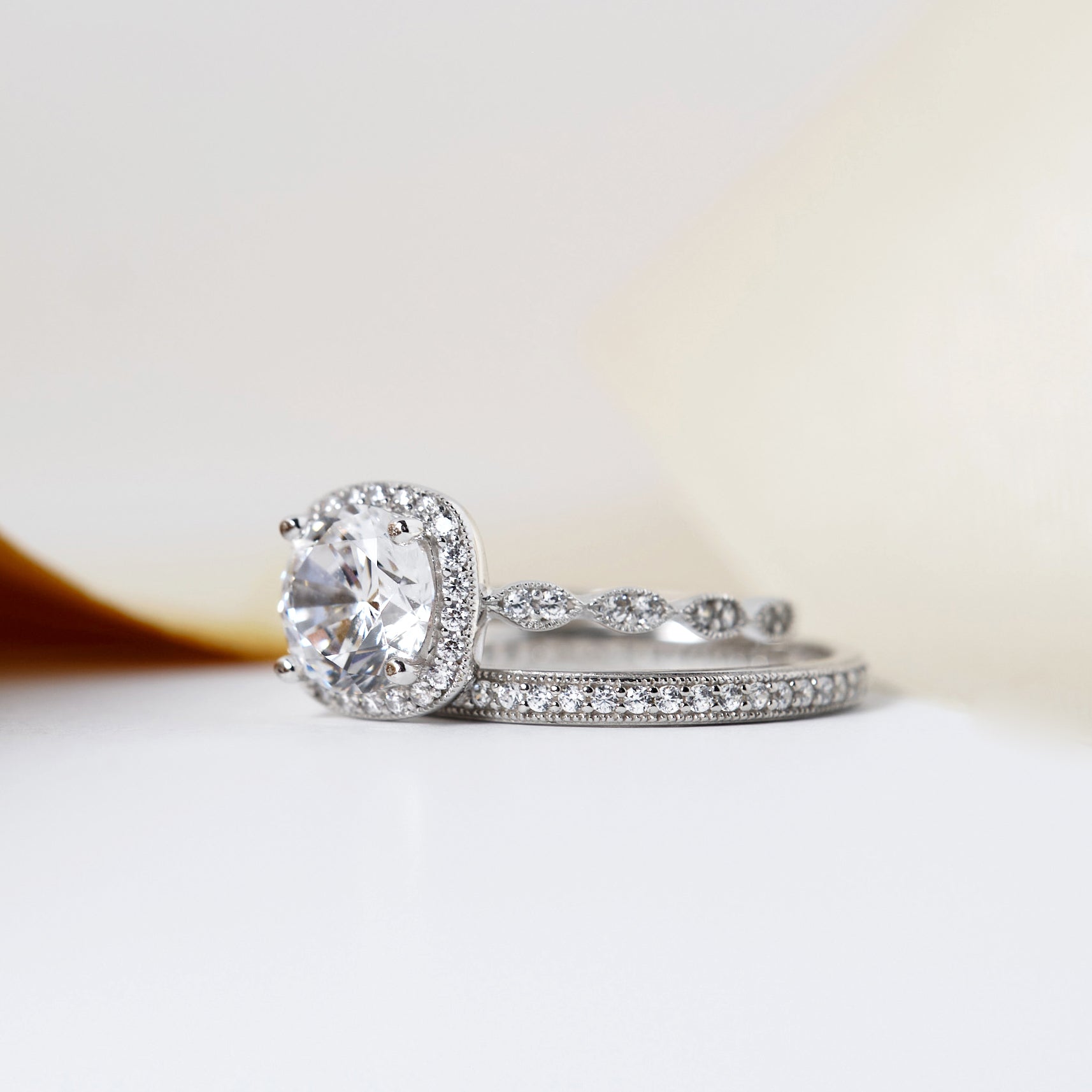 Vintage Art Deco • Grand Round Halo Milgrain Ring Set • Sterling Silver • BR6053-2M