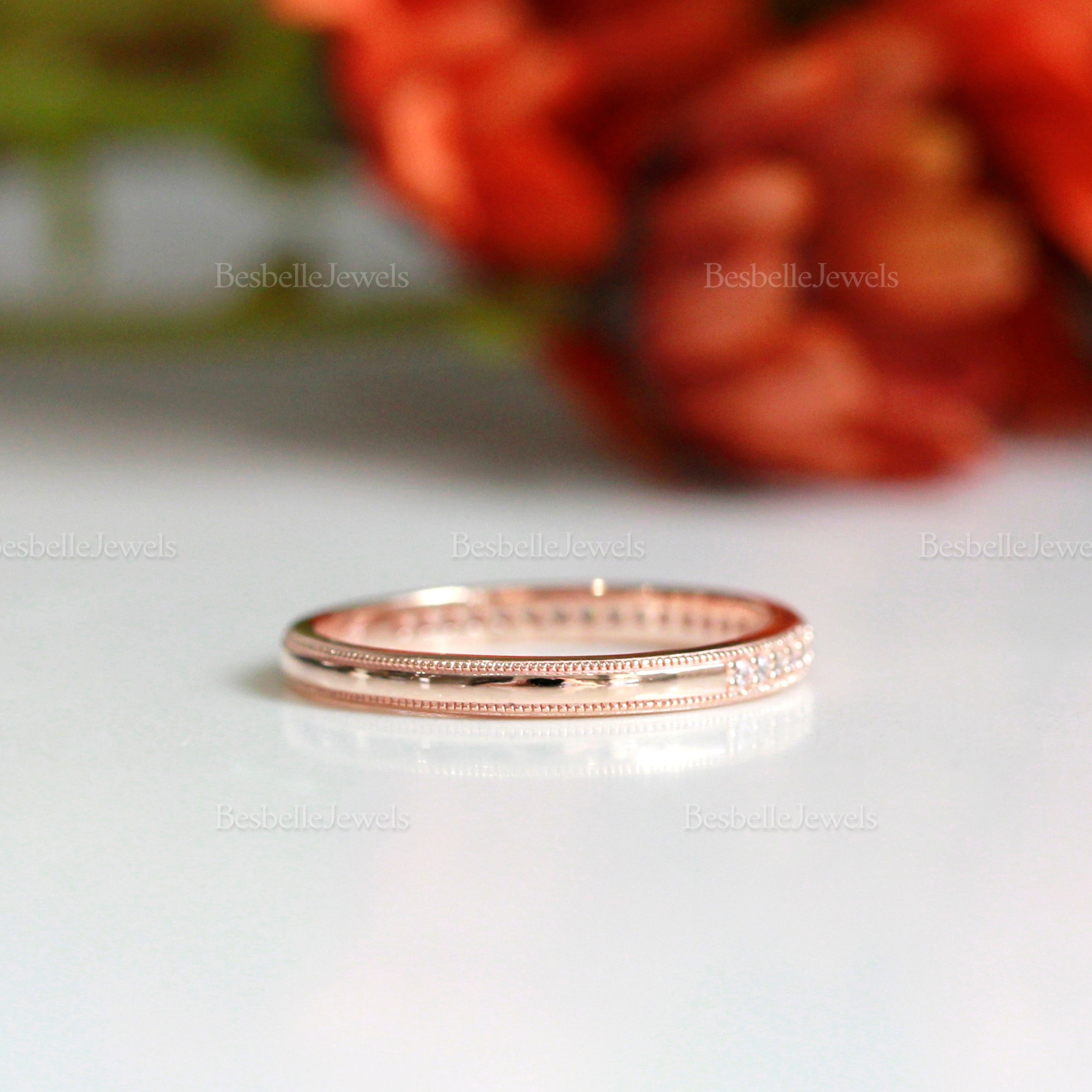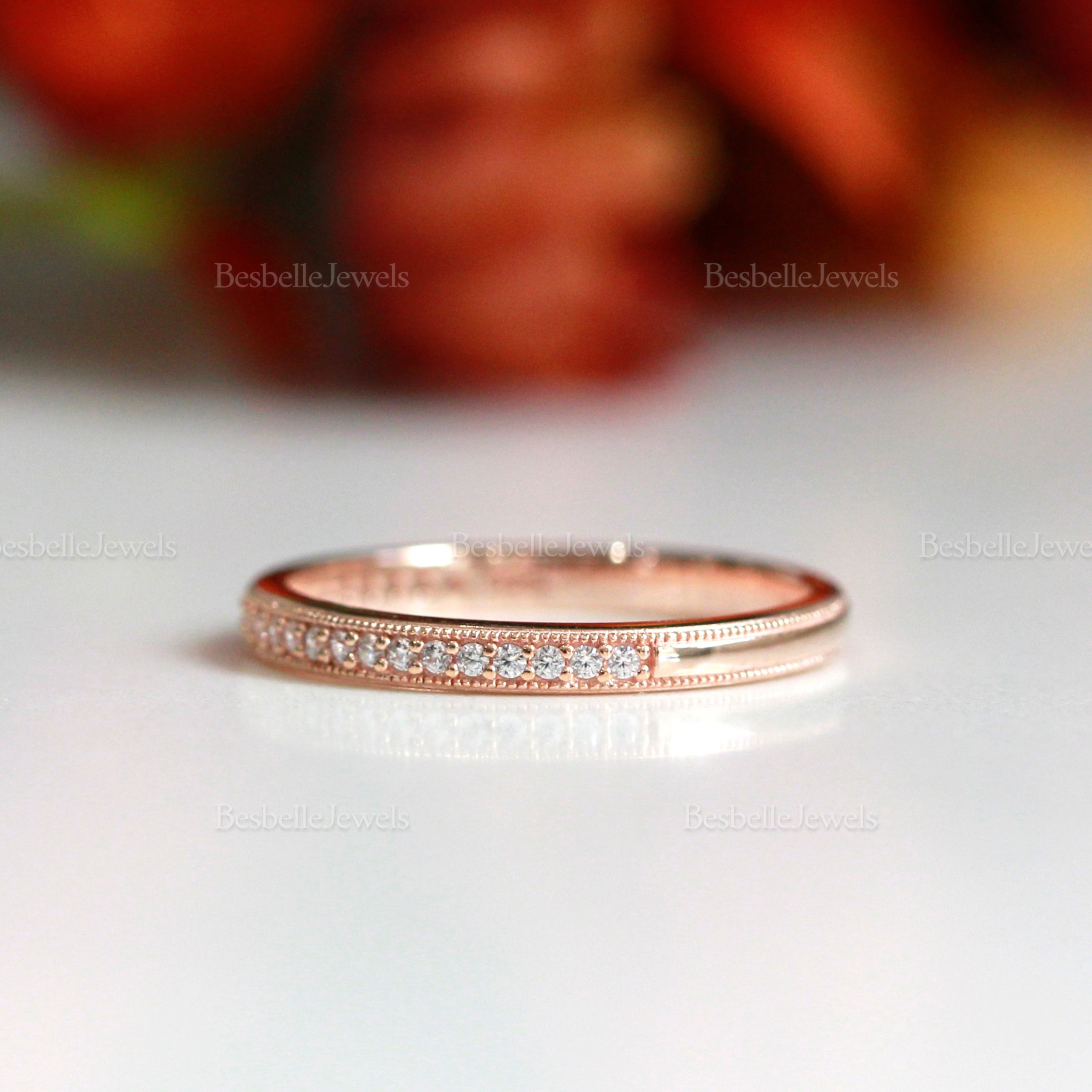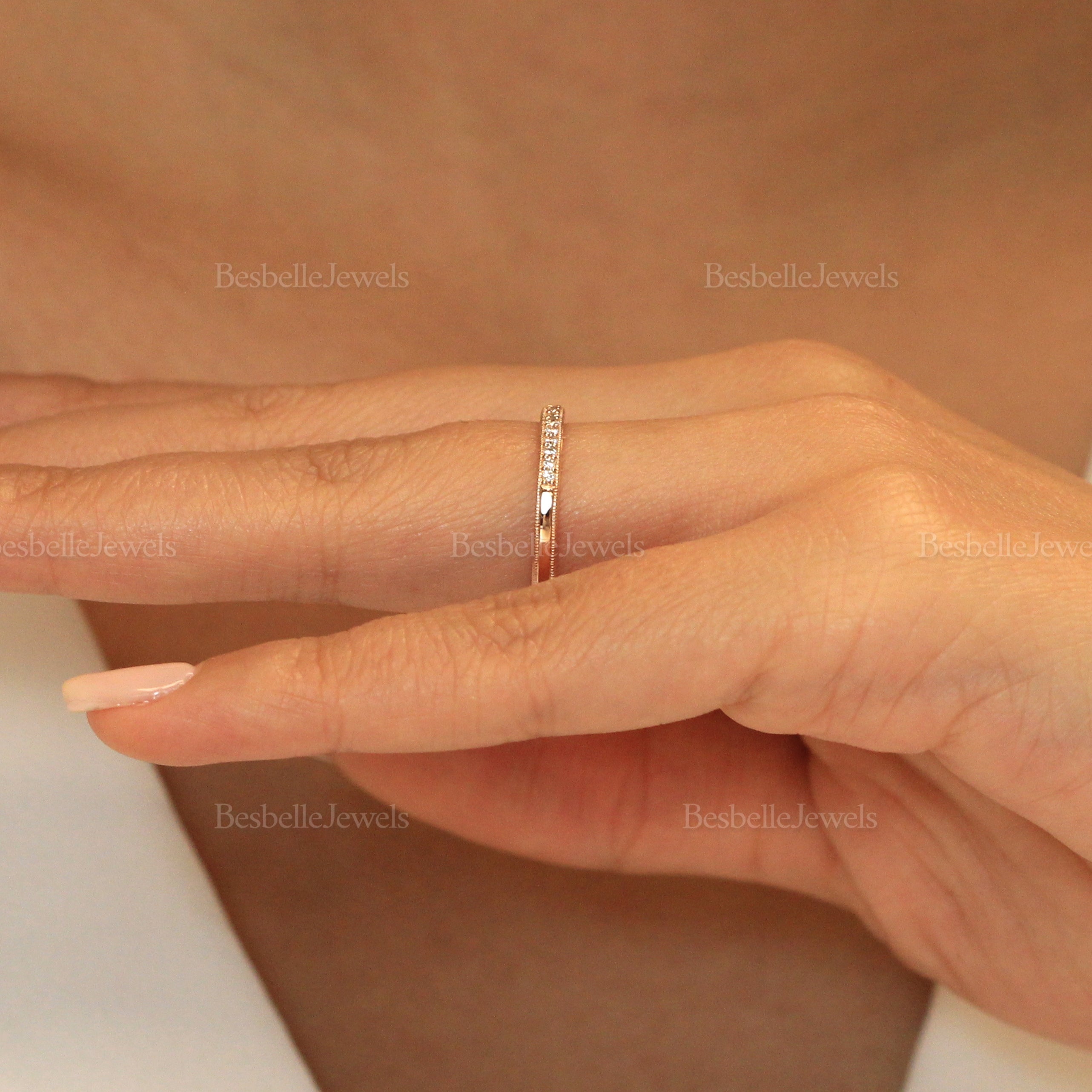 A half eternity band with a milgrain pavé design. Pleasantly stackable with other bands or a main ring to add some layers to your style.