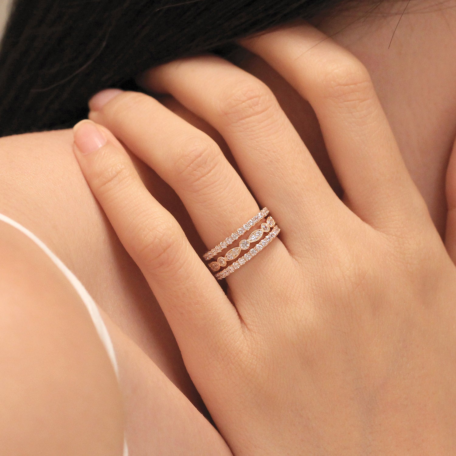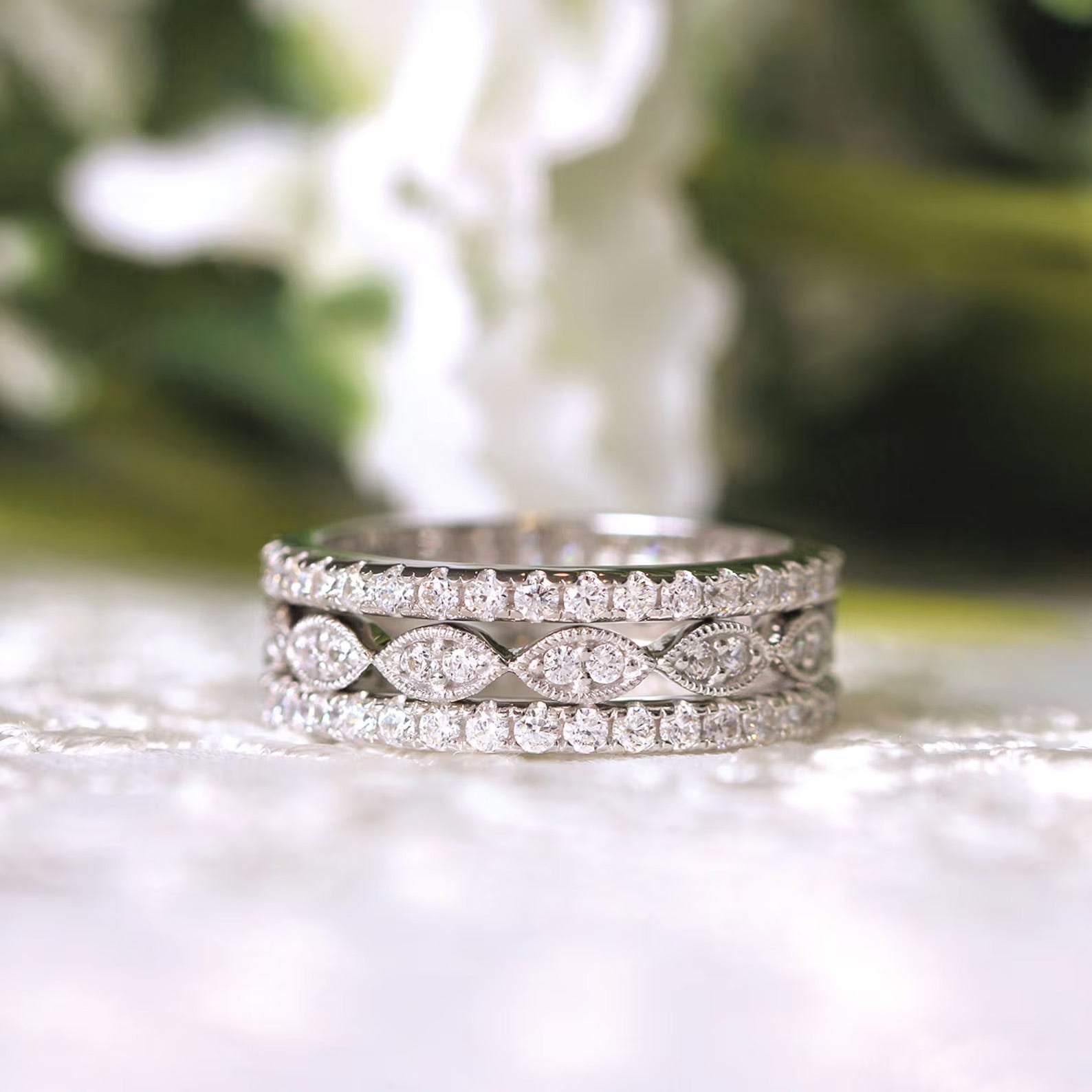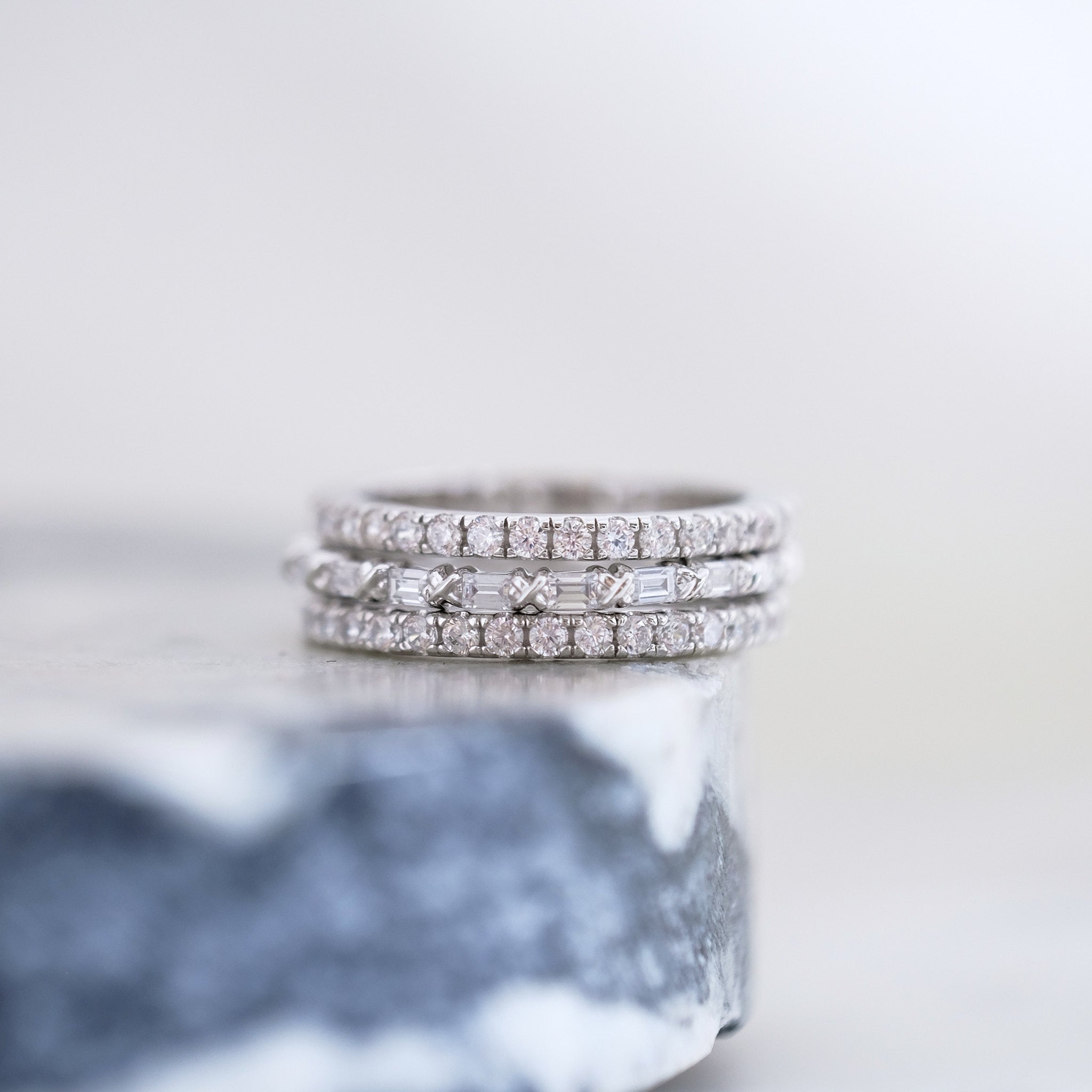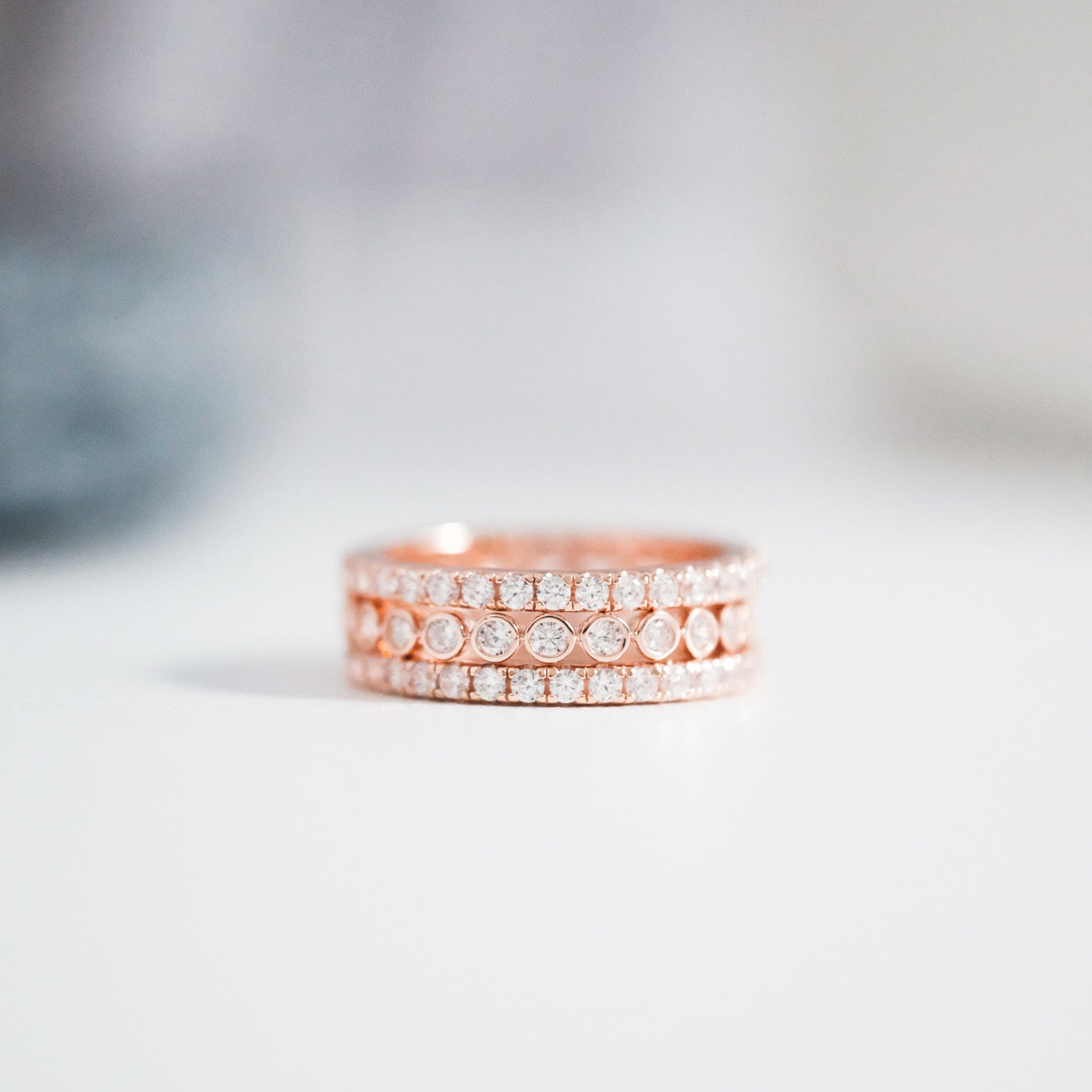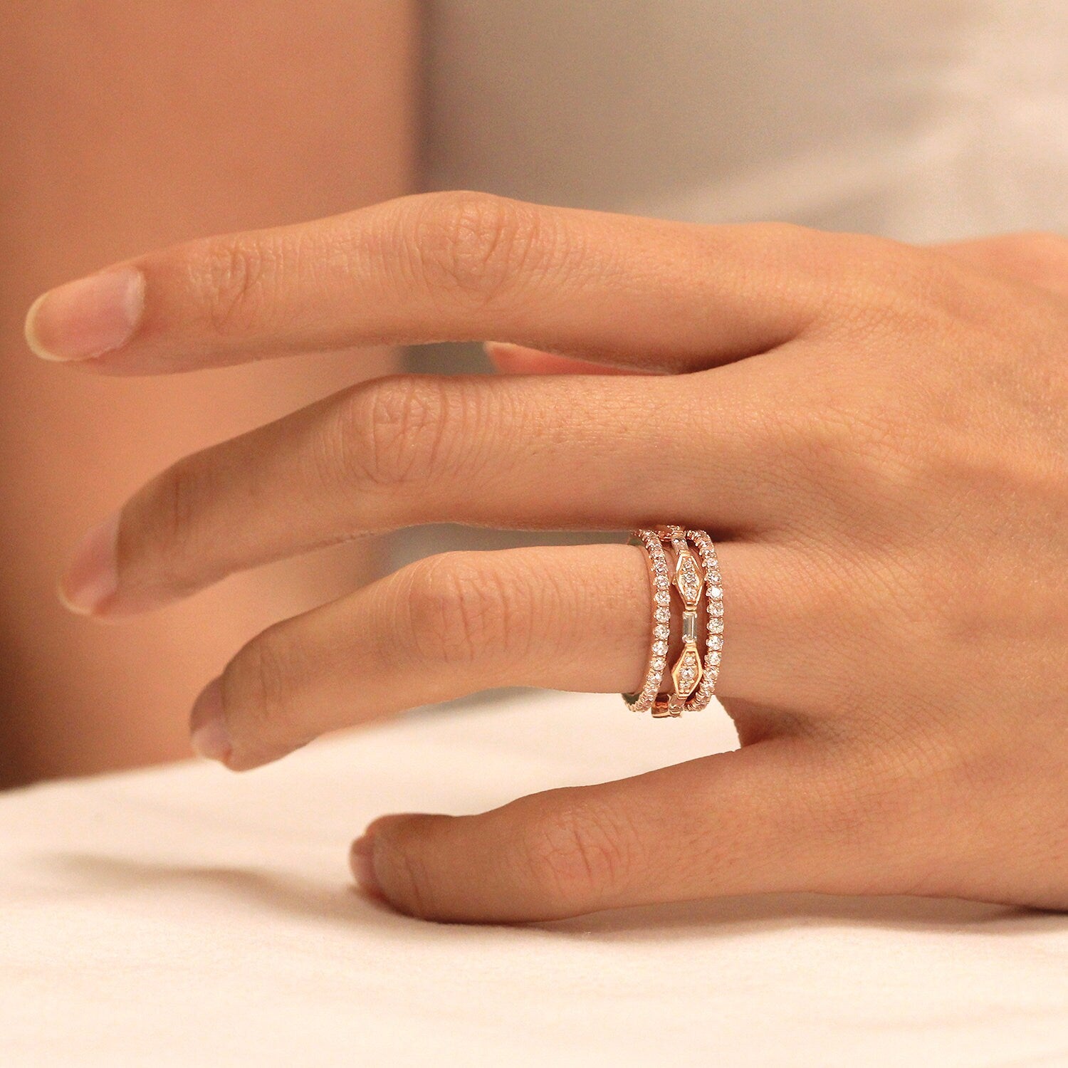 The Triple Band Stacks collection offers a combination of three bands stacked together to create a bold and elegant layered look. This collection is perfect for those who enjoy stacking and layering their rings, offering a striking and customizable style. With its sleek design, the Triple Band Stacks is a favorite for anyone looking to add more dimension to their jewelry collection.