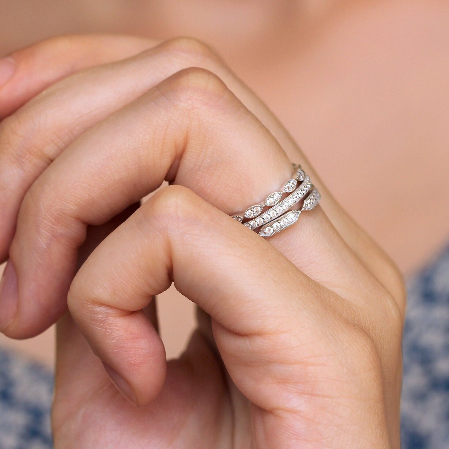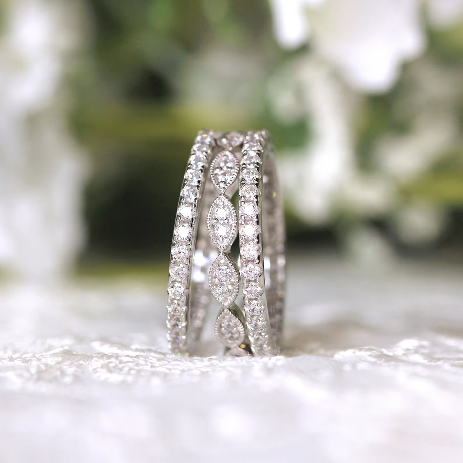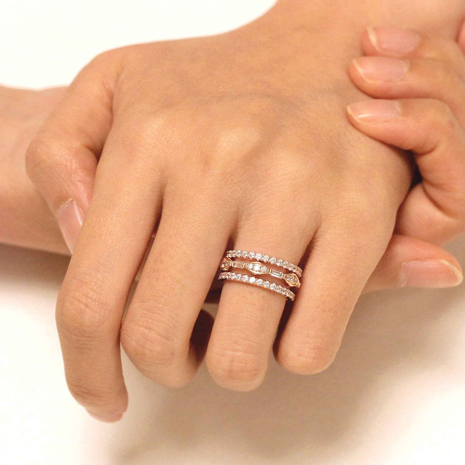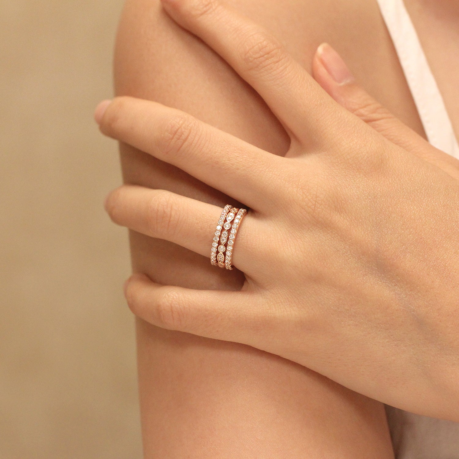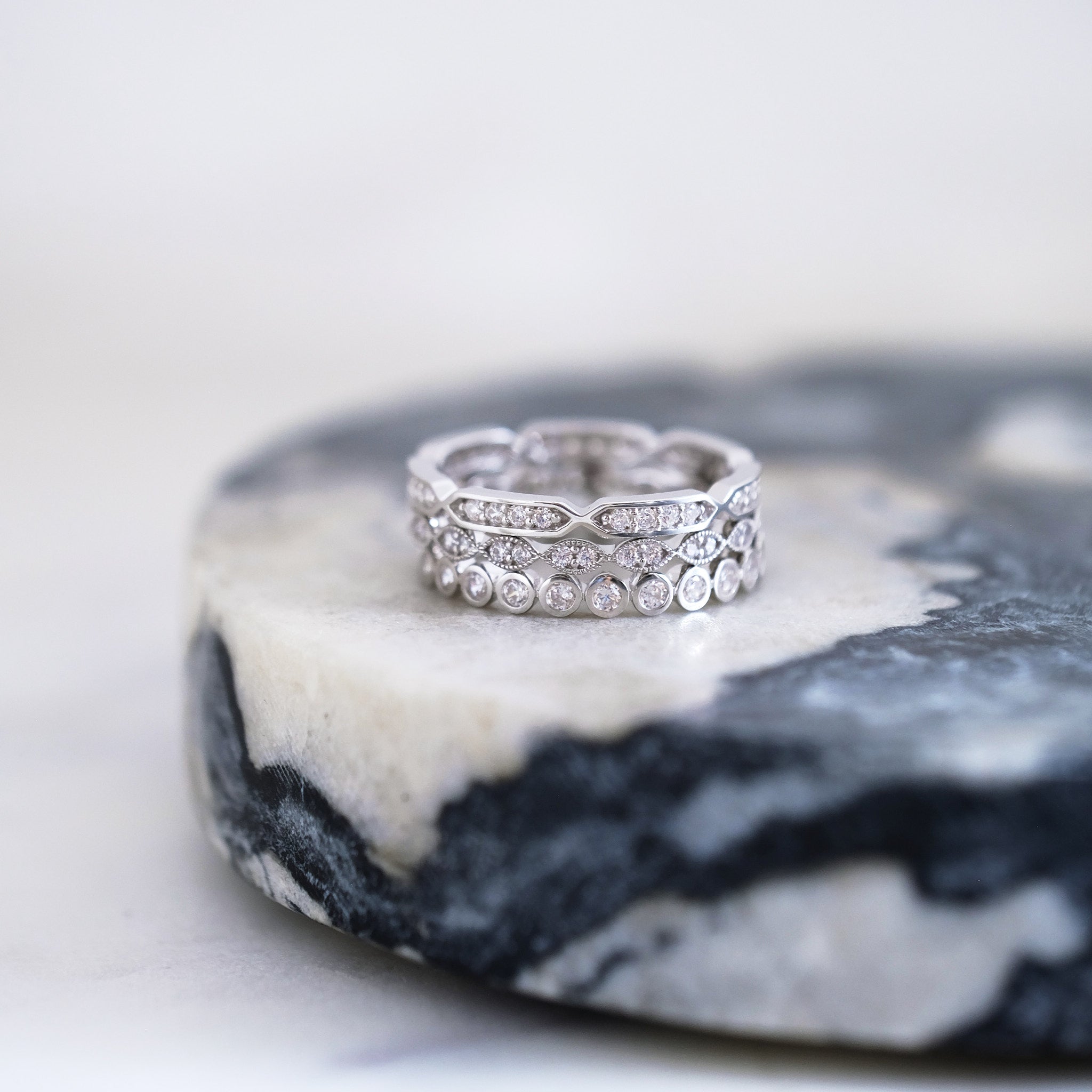 The Triple Band Stacks collection offers a combination of three bands stacked together to create a bold and elegant layered look. This collection is perfect for those who enjoy stacking and layering their rings, offering a striking and customizable style. With its sleek design, the Triple Band Stacks is a favorite for anyone looking to add more dimension to their jewelry collection.
