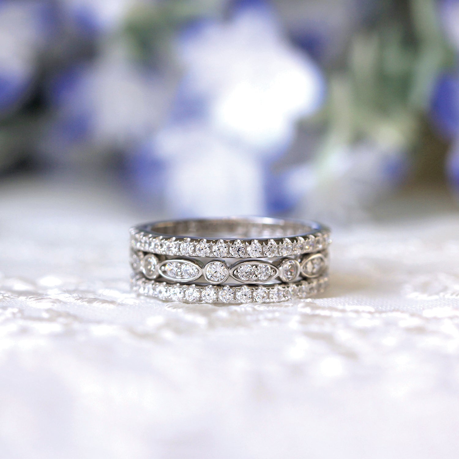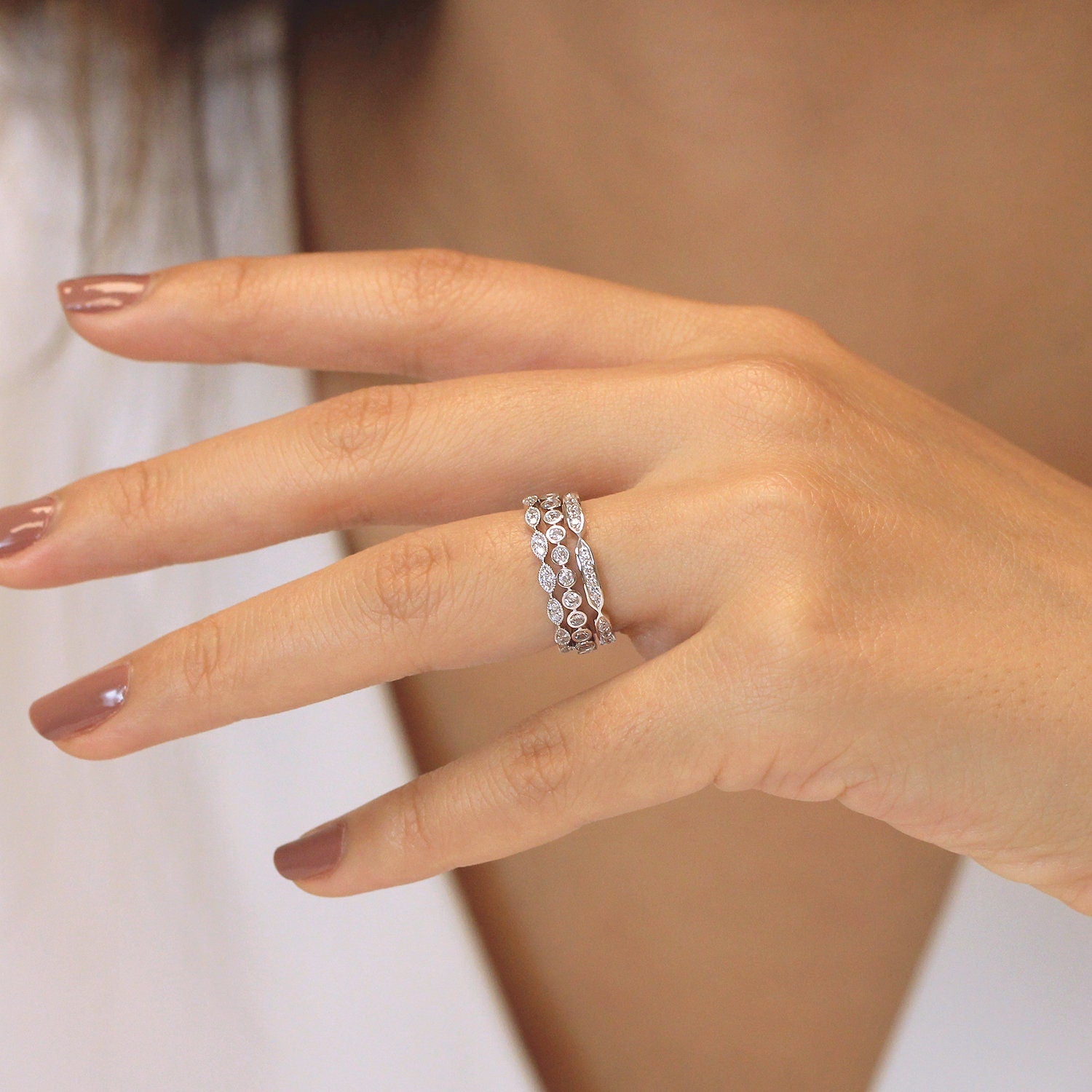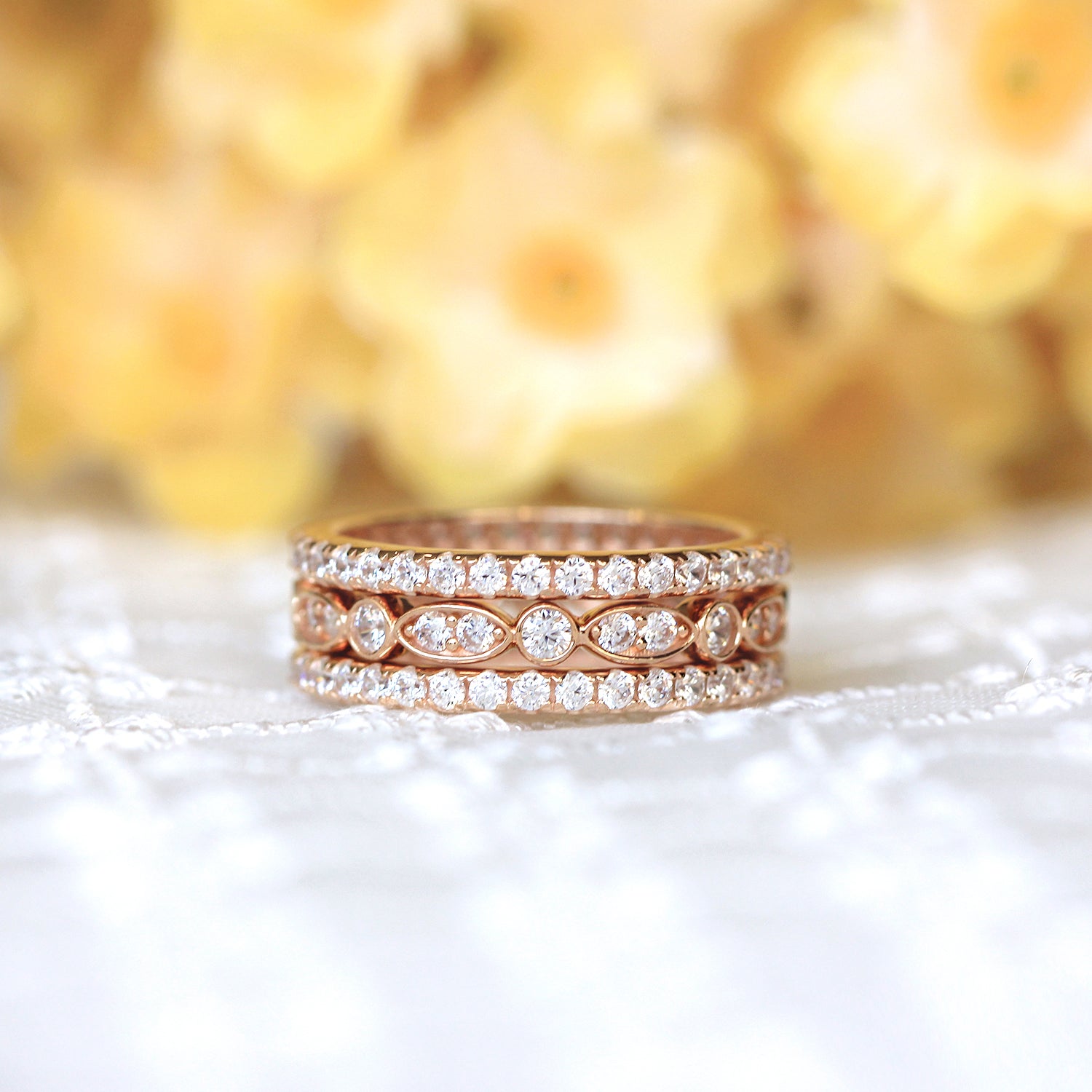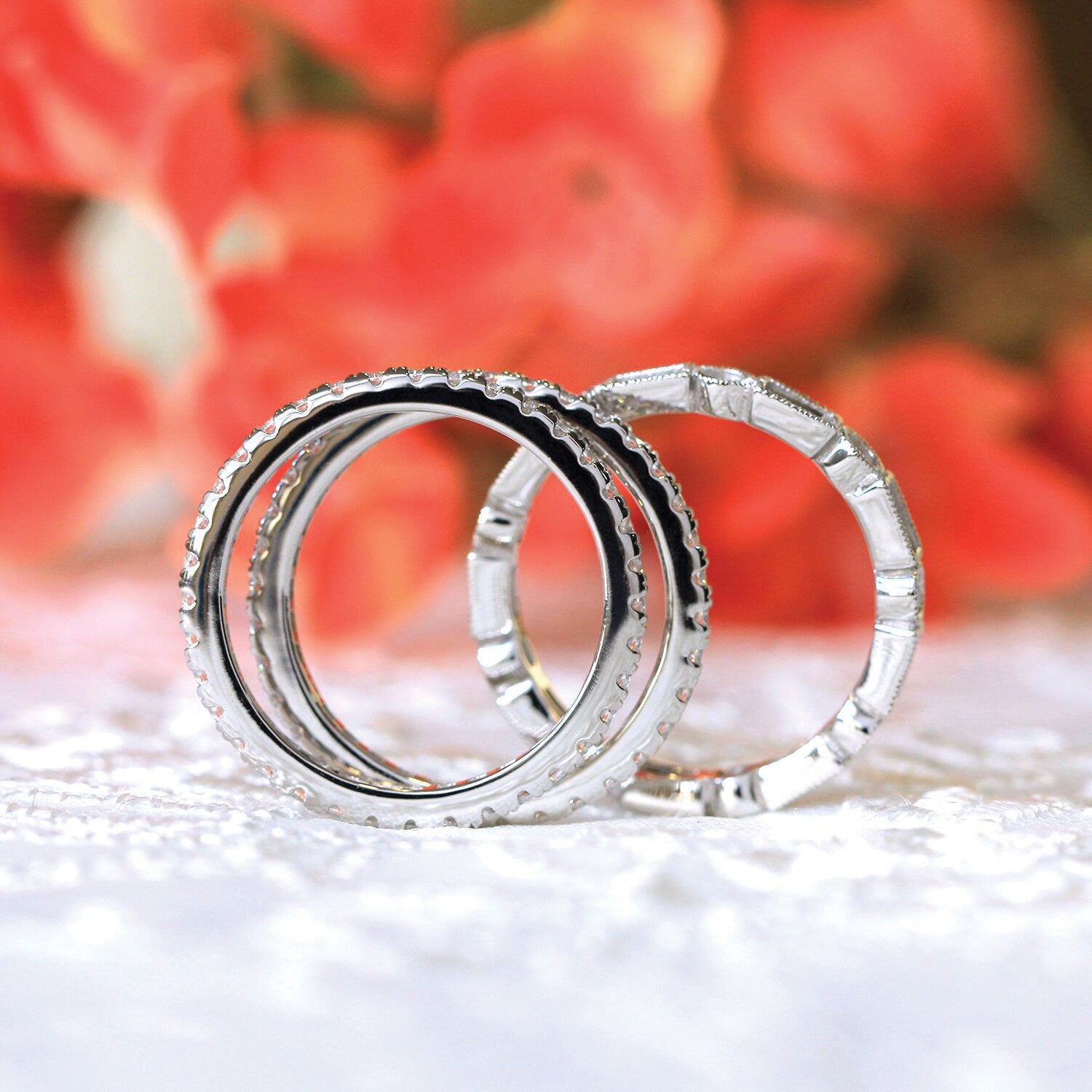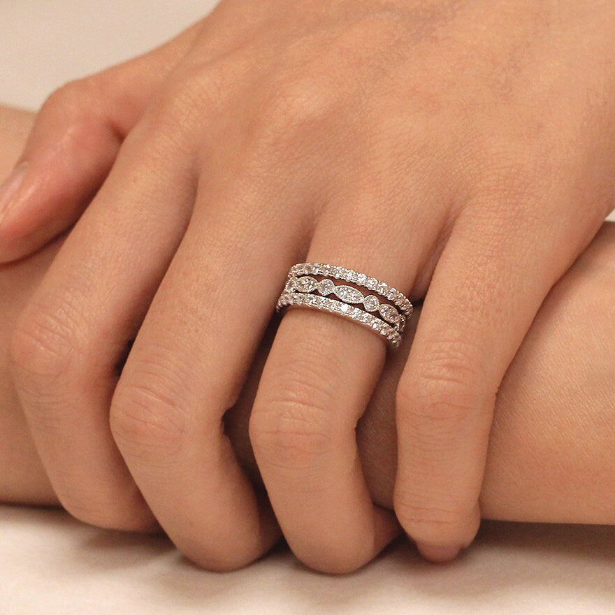 The Triple Band Stacks collection offers a combination of three bands stacked together to create a bold and elegant layered look. This collection is perfect for those who enjoy stacking and layering their rings, offering a striking and customizable style. With its sleek design, the Triple Band Stacks is a favorite for anyone looking to add more dimension to their jewelry collection.