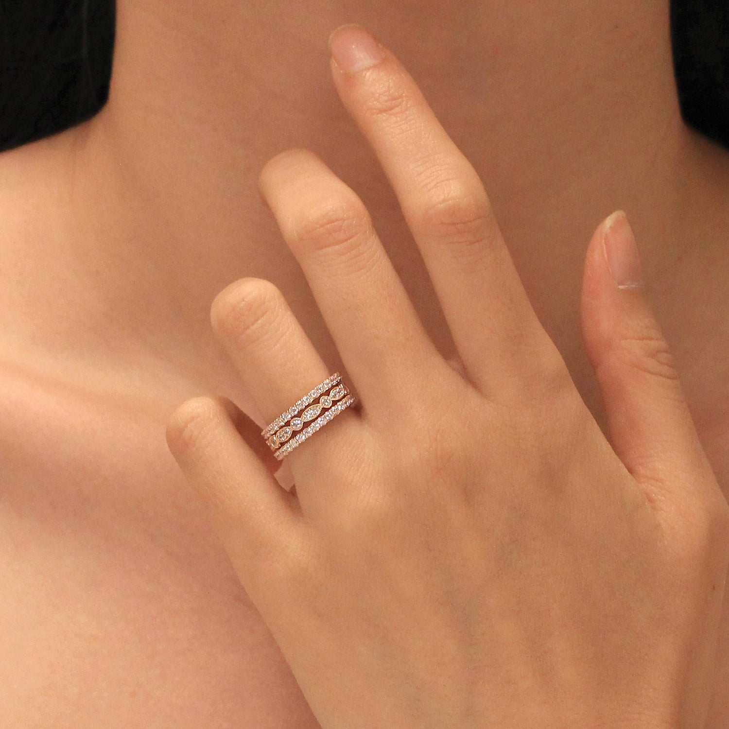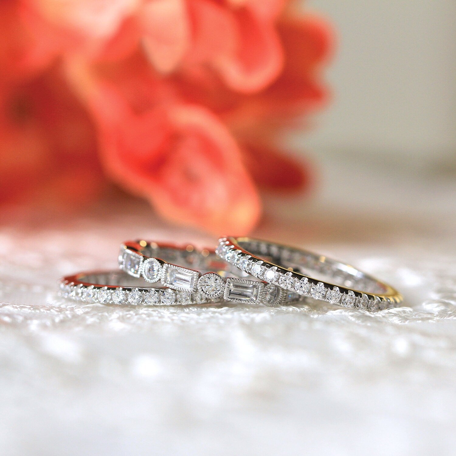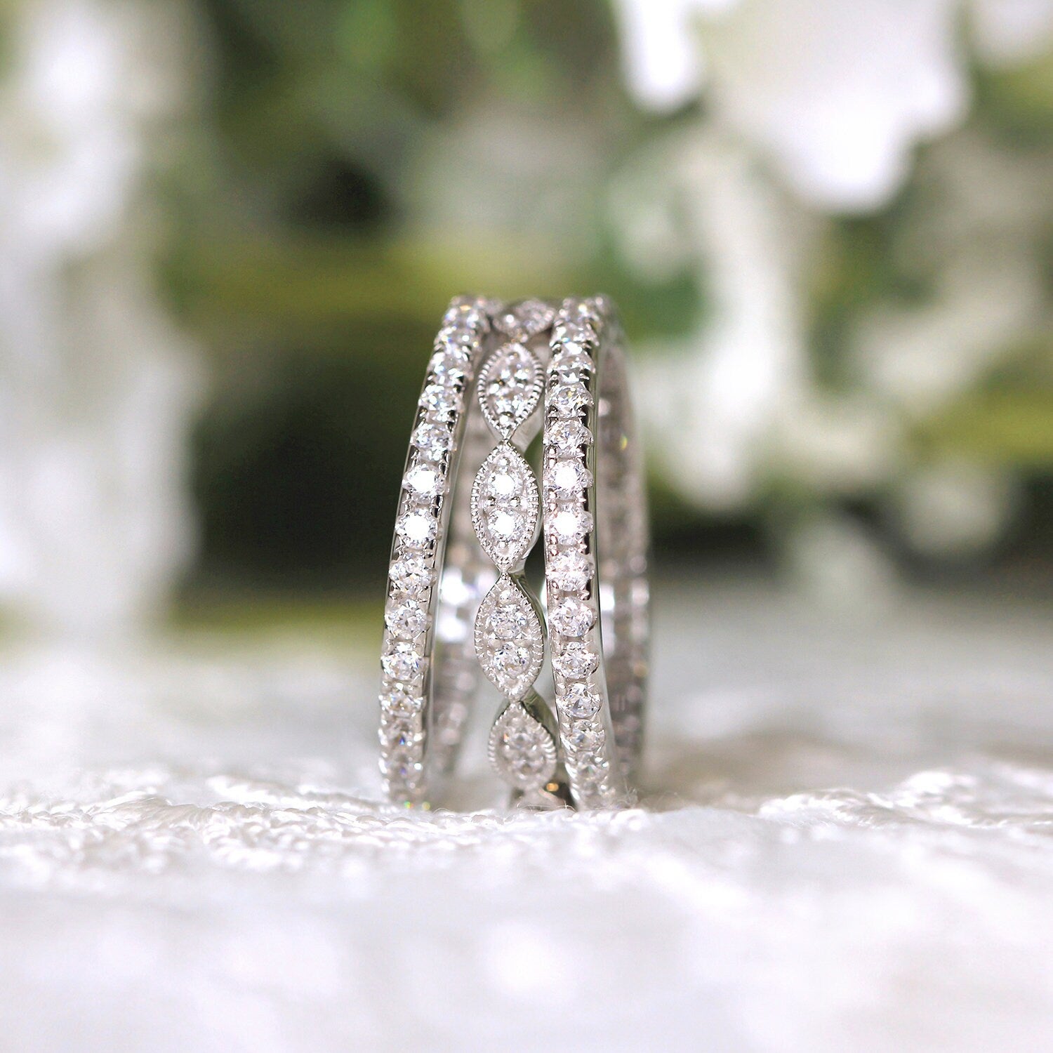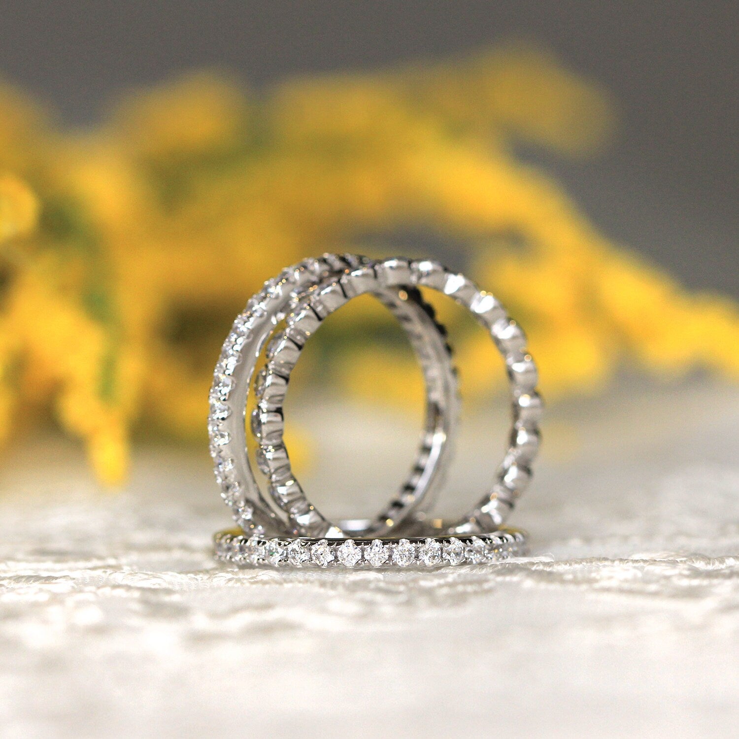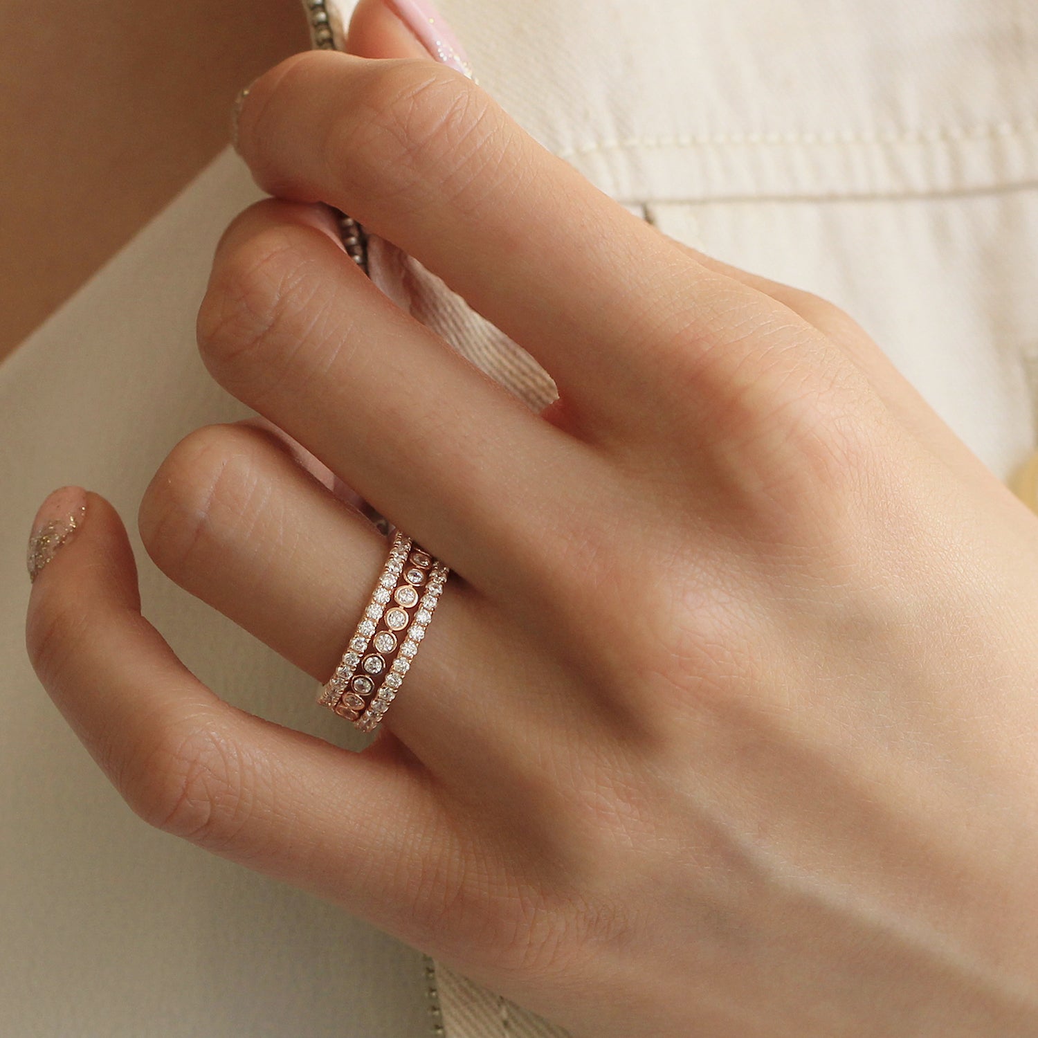 The Triple Band Stacks collection offers a combination of three bands stacked together to create a bold and elegant layered look. This collection is perfect for those who enjoy stacking and layering their rings, offering a striking and customizable style. With its sleek design, the Triple Band Stacks is a favorite for anyone looking to add more dimension to their jewelry collection.