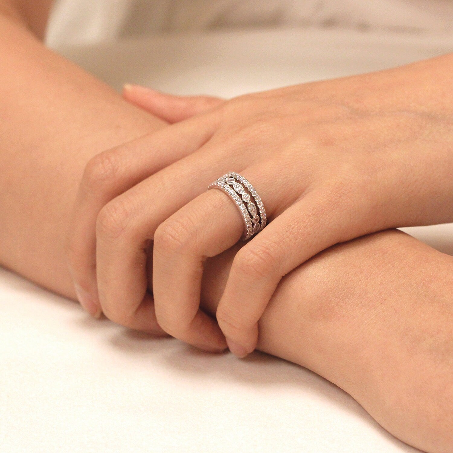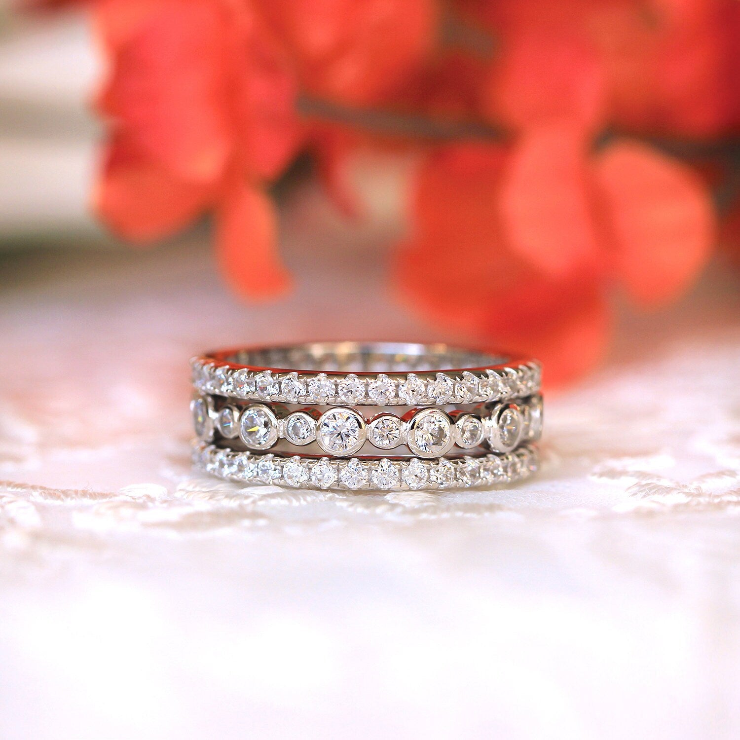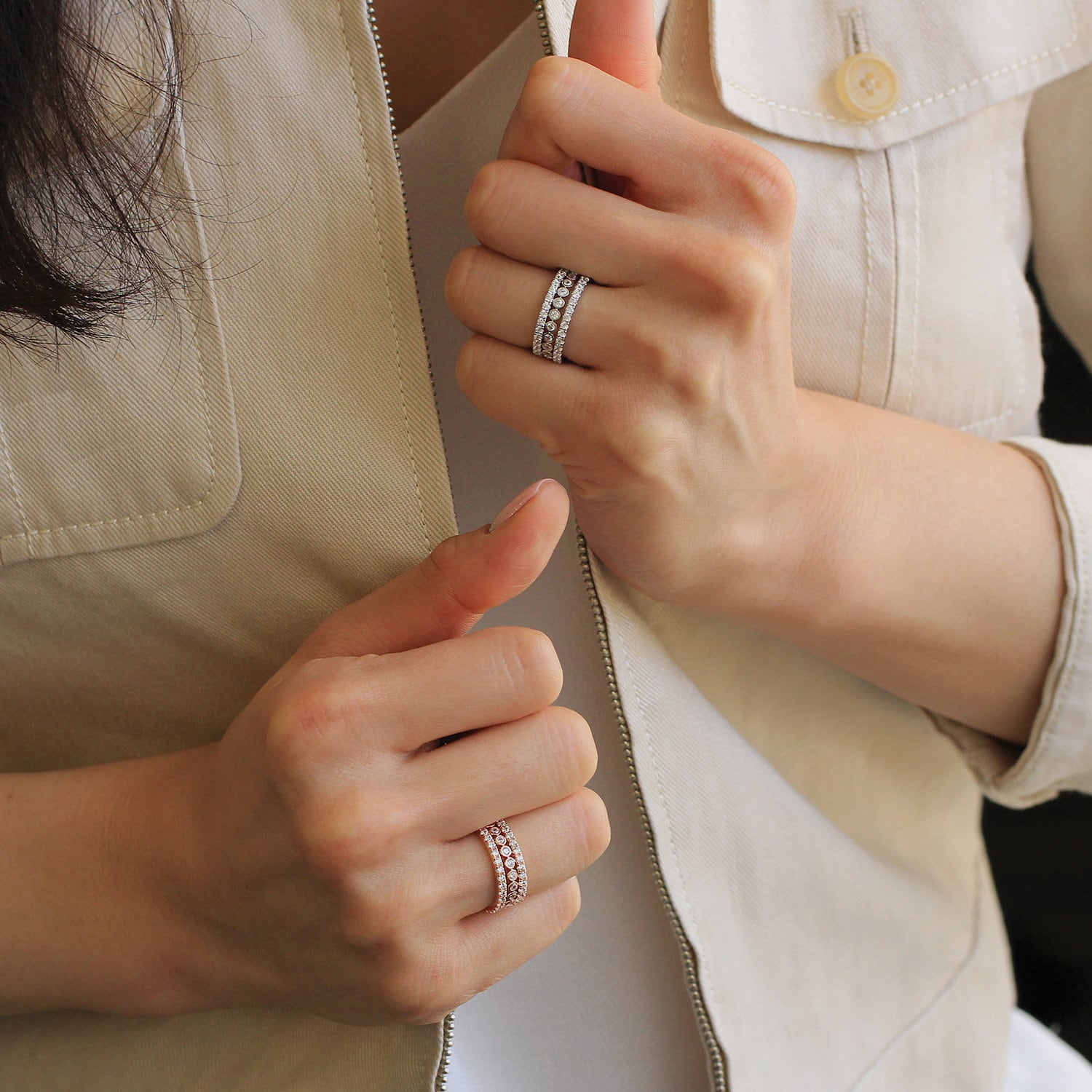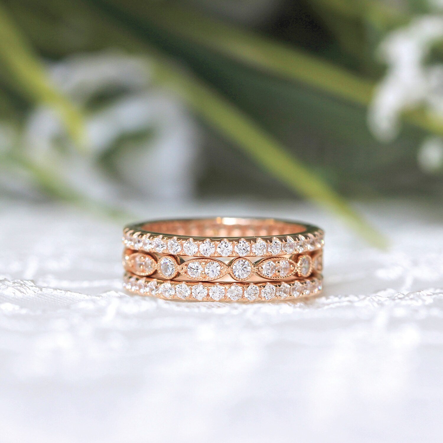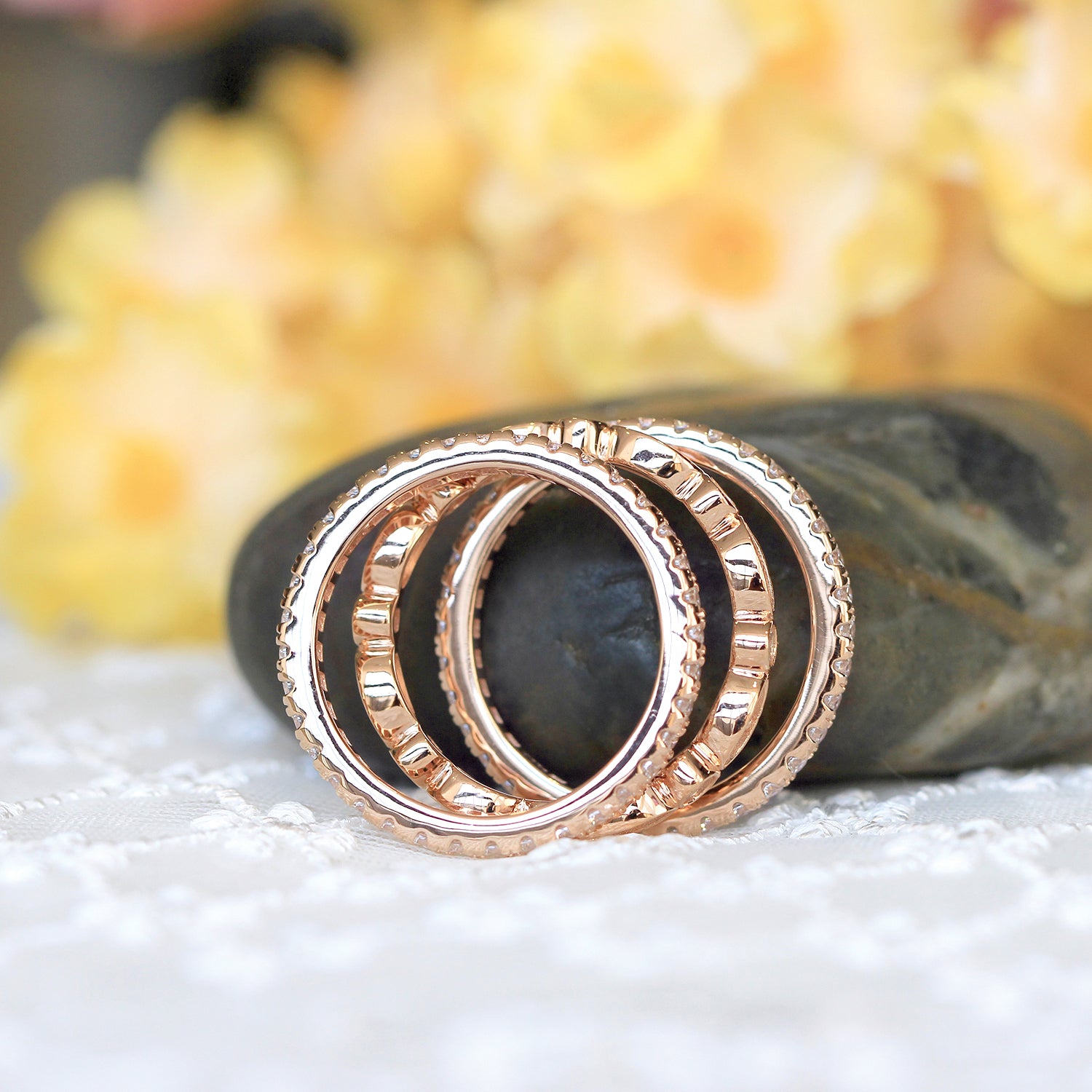 The Triple Band Stacks collection offers a combination of three bands stacked together to create a bold and elegant layered look. This collection is perfect for those who enjoy stacking and layering their rings, offering a striking and customizable style. With its sleek design, the Triple Band Stacks is a favorite for anyone looking to add more dimension to their jewelry collection.