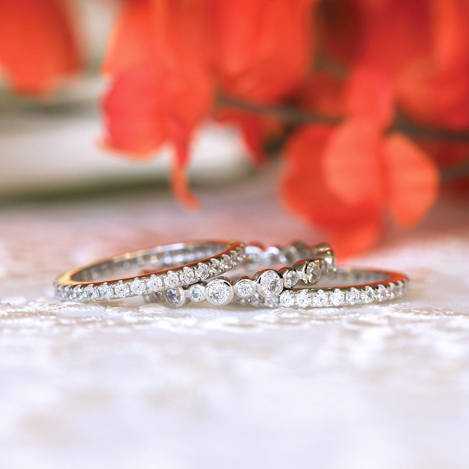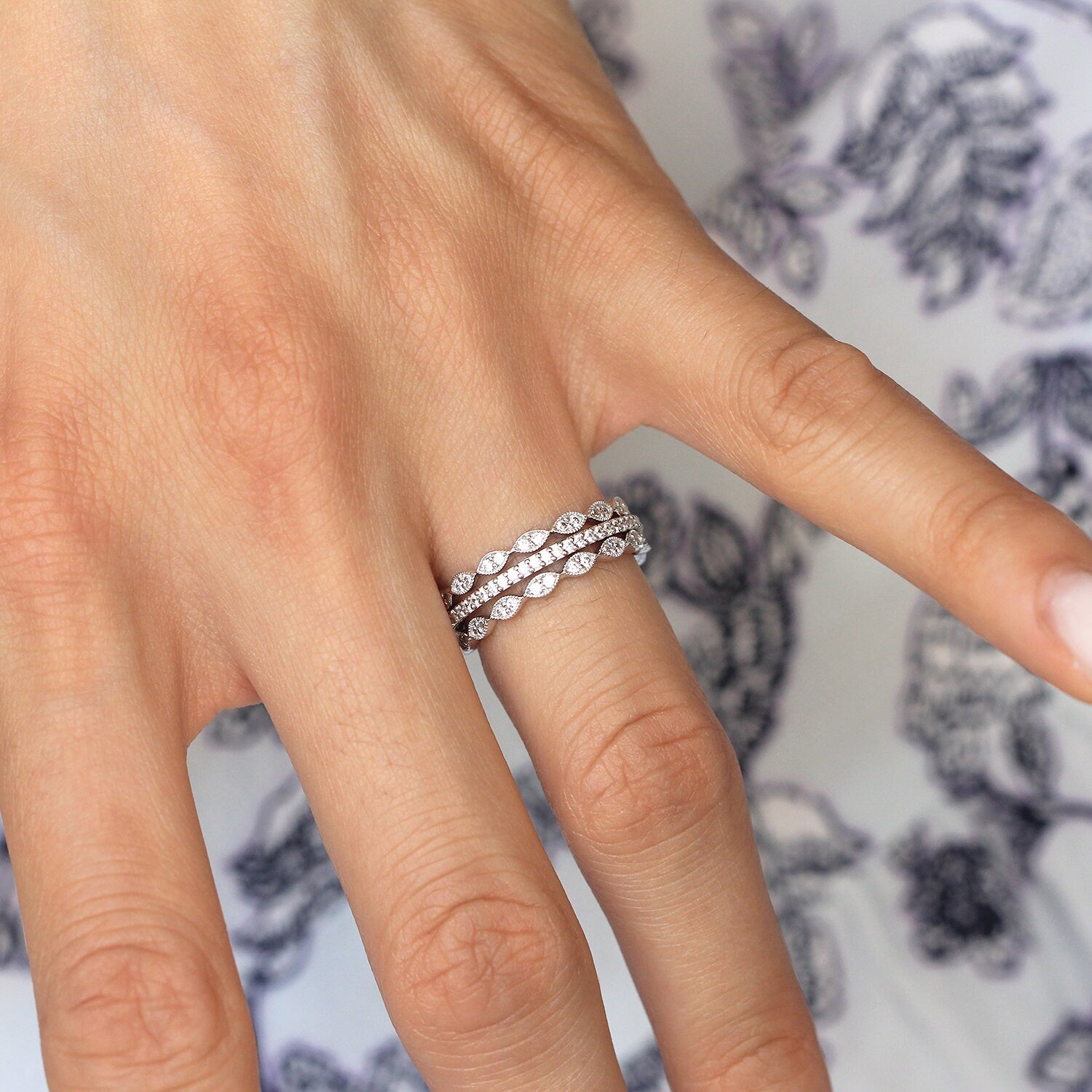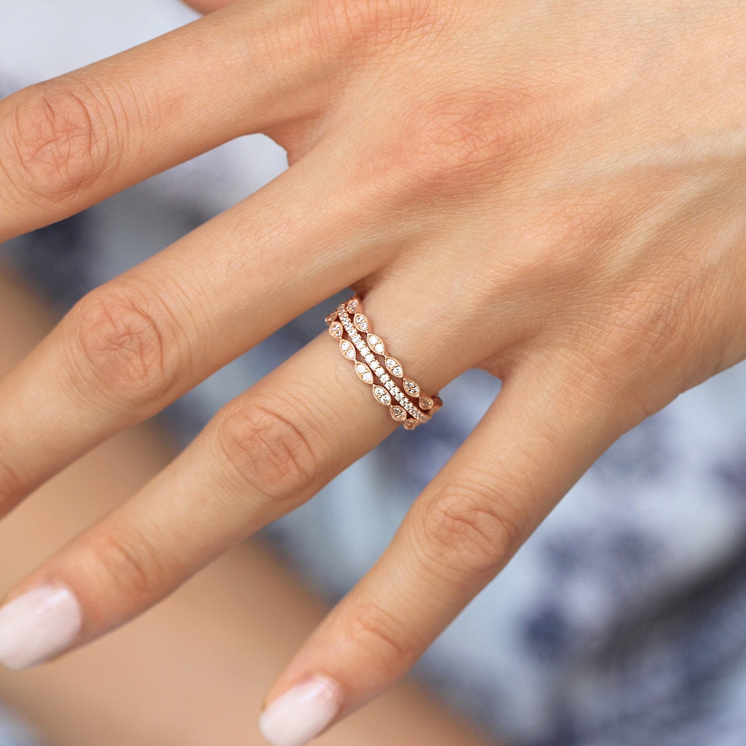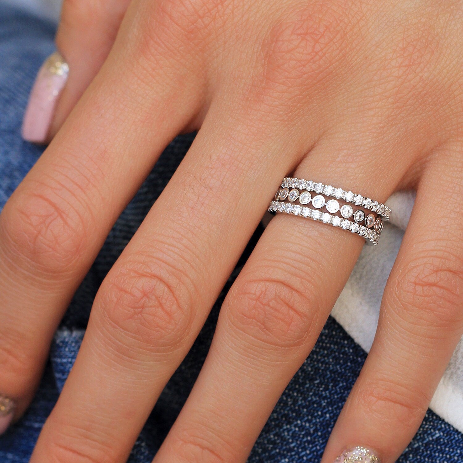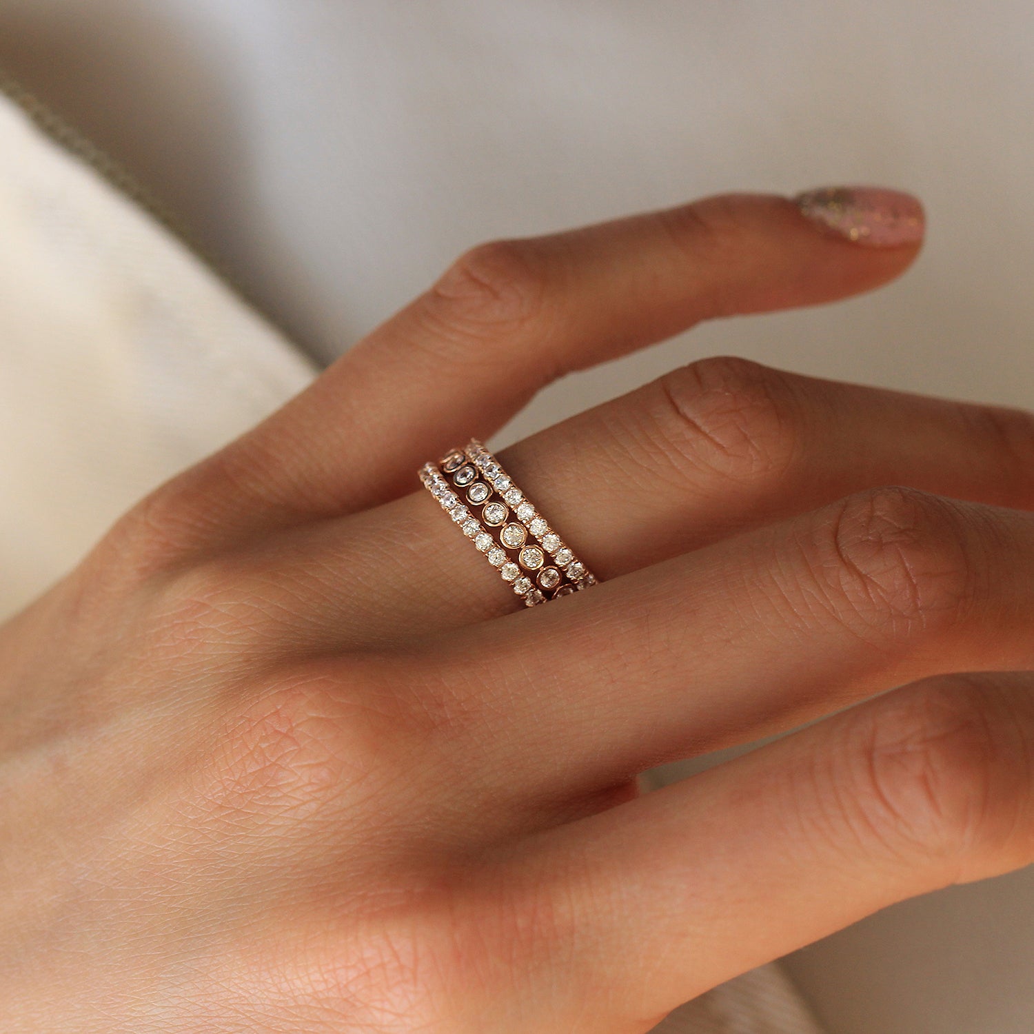 The Triple Band Stacks collection offers a combination of three bands stacked together to create a bold and elegant layered look. This collection is perfect for those who enjoy stacking and layering their rings, offering a striking and customizable style. With its sleek design, the Triple Band Stacks is a favorite for anyone looking to add more dimension to their jewelry collection.