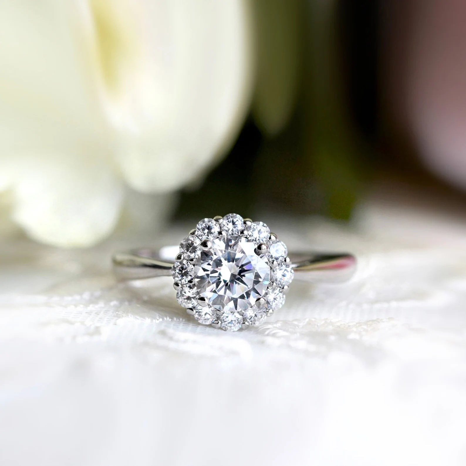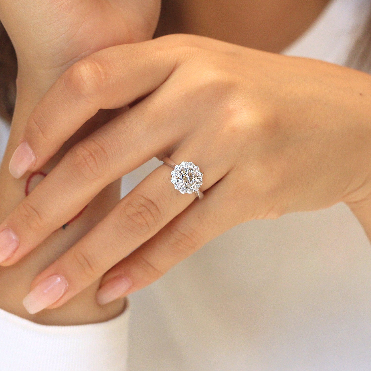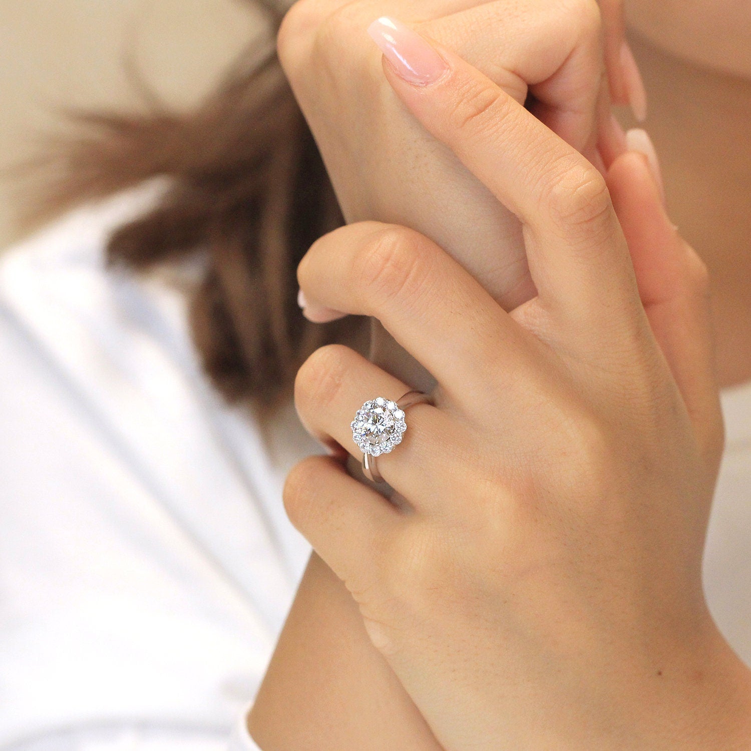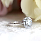 - Center Stone: Brilliant Cut, Pavé Set Halo