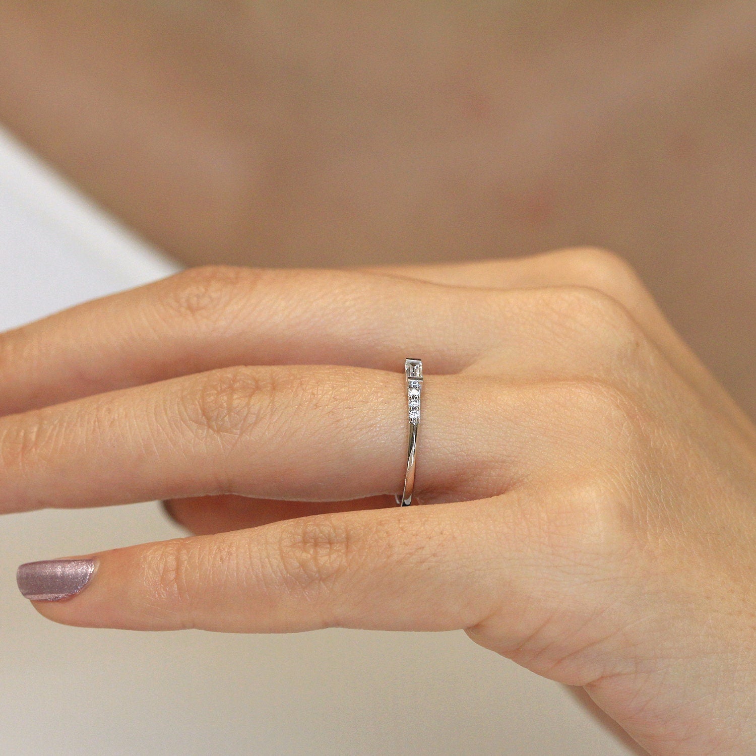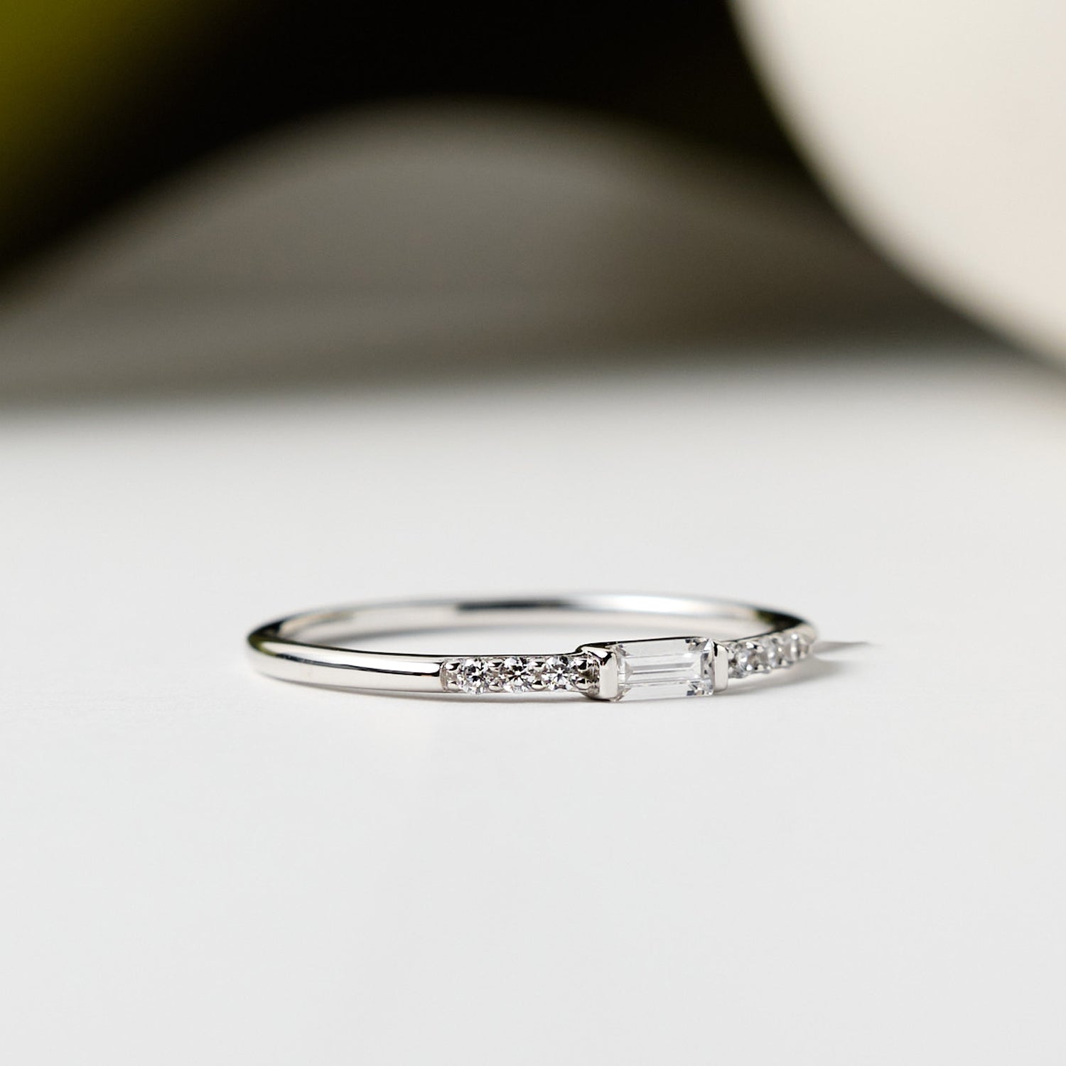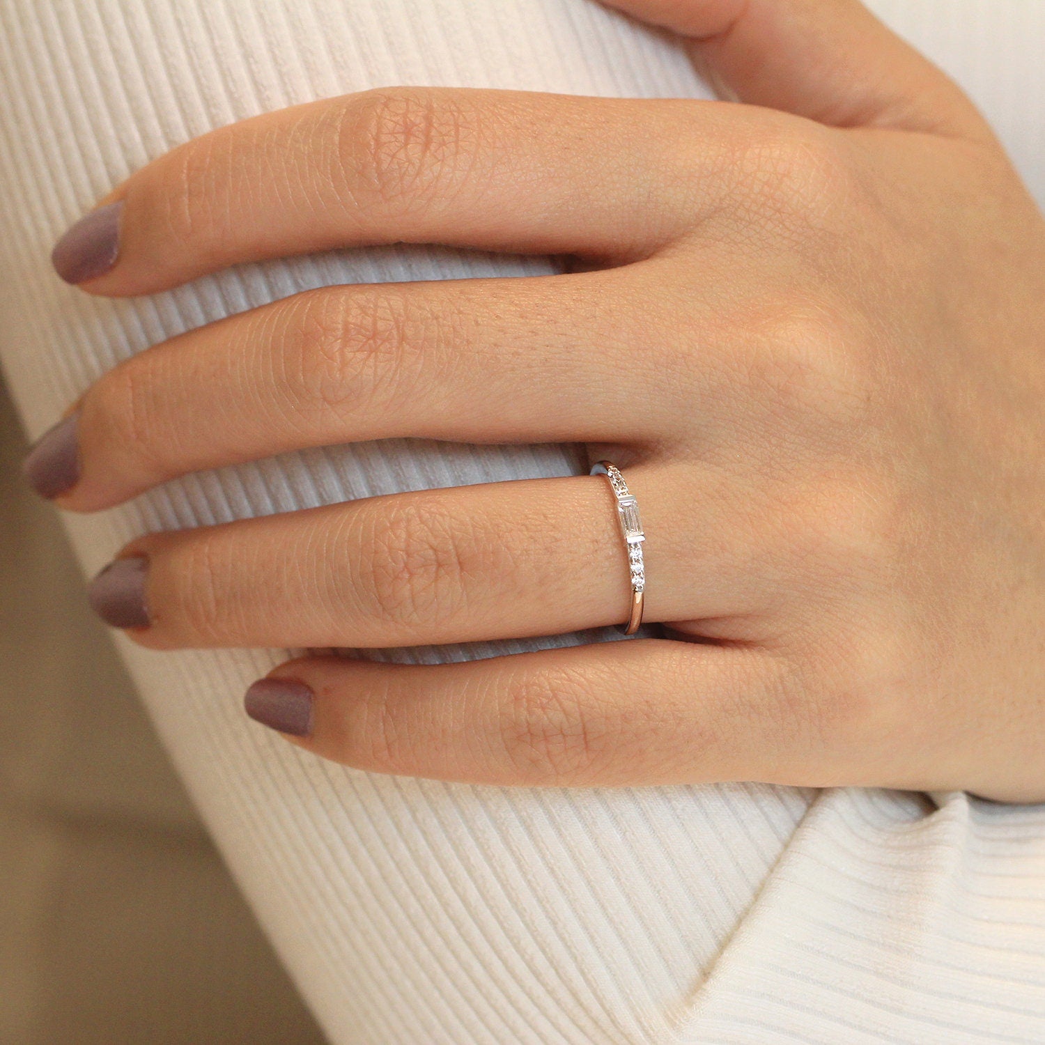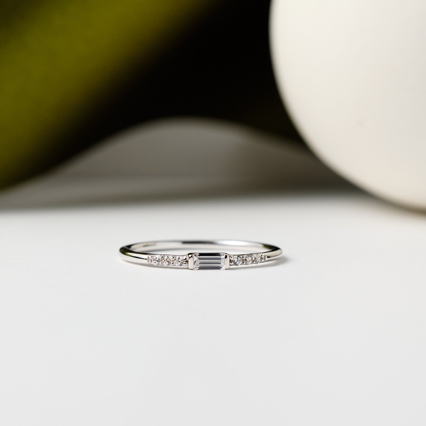 The Meg Horizon Ring has an Elegant Emerald Baguette Cut as the centerpiece with a mini Pave Set trail. Made for Minimalist Enthusiasts.